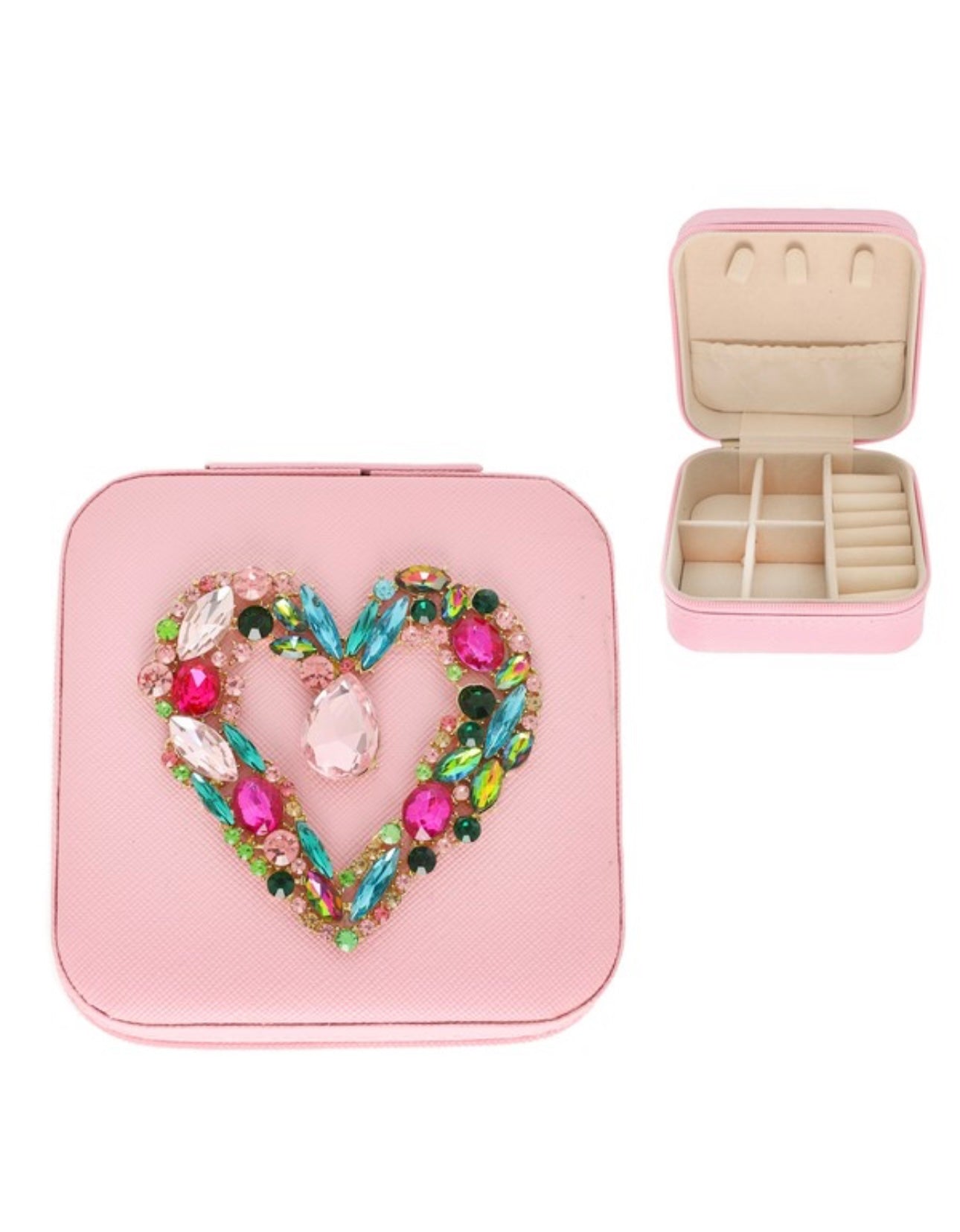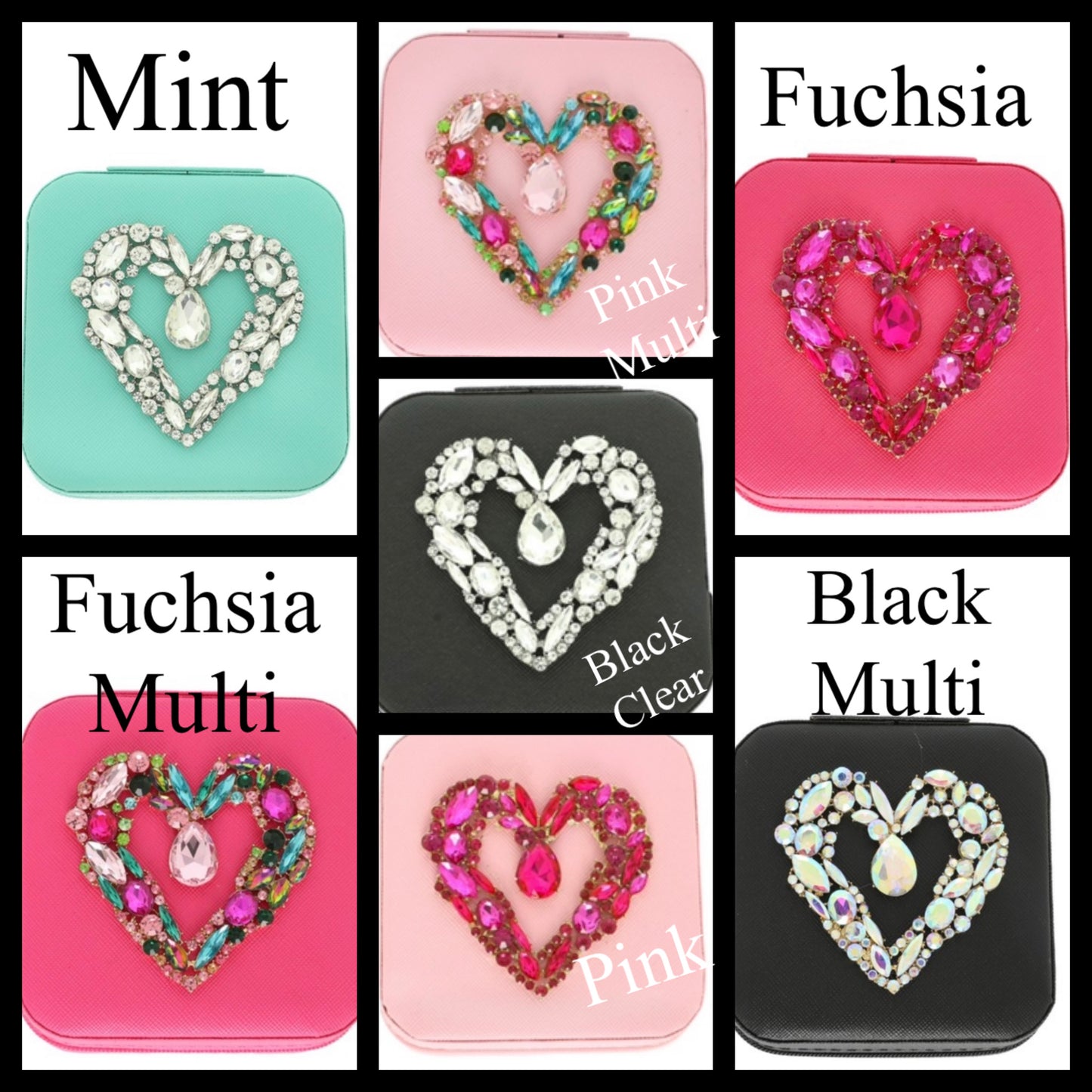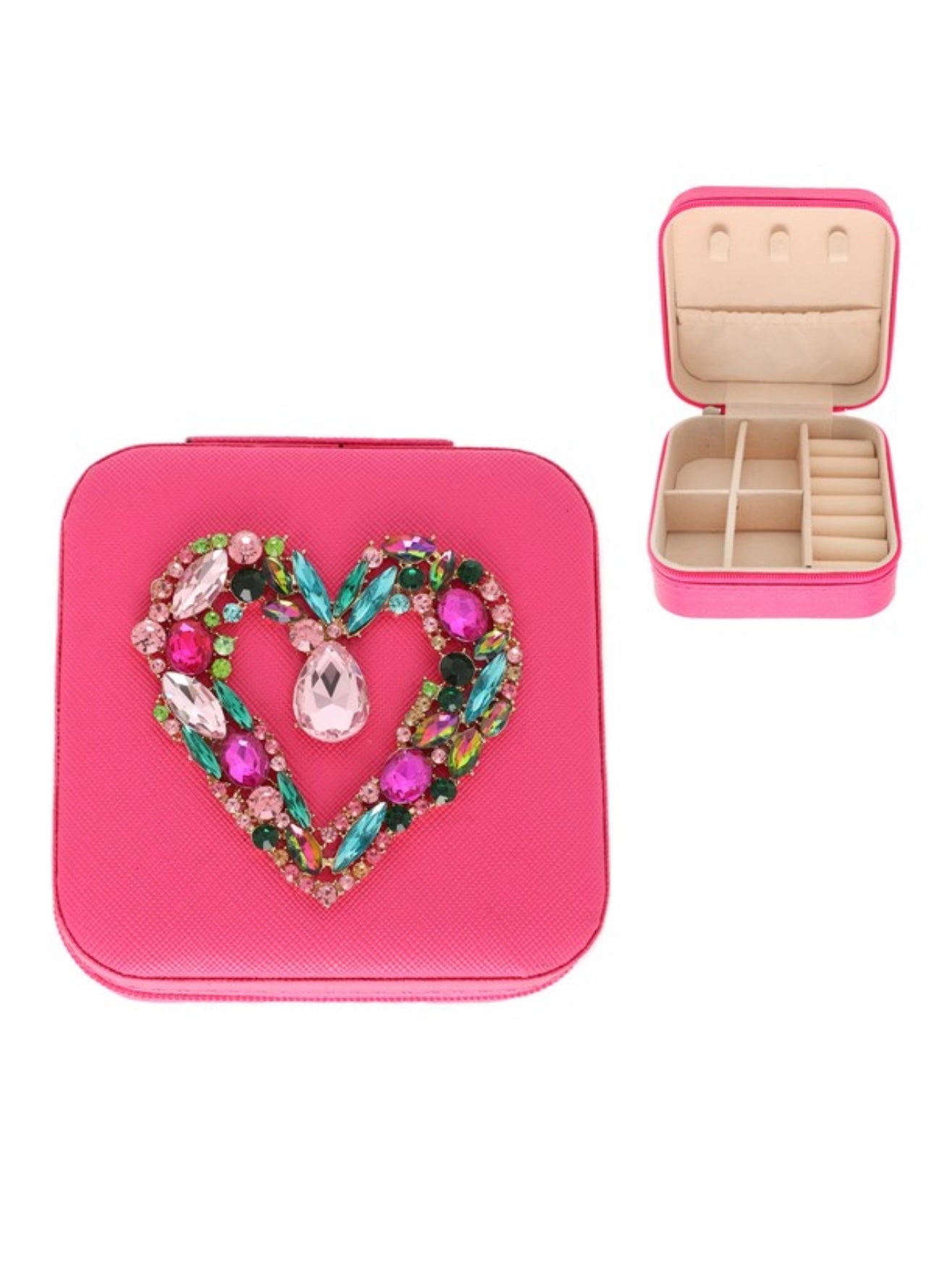 Heart crystal embellished travel jewelry box with multiple compartments!
