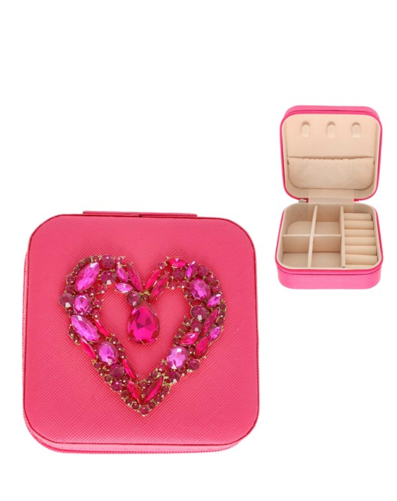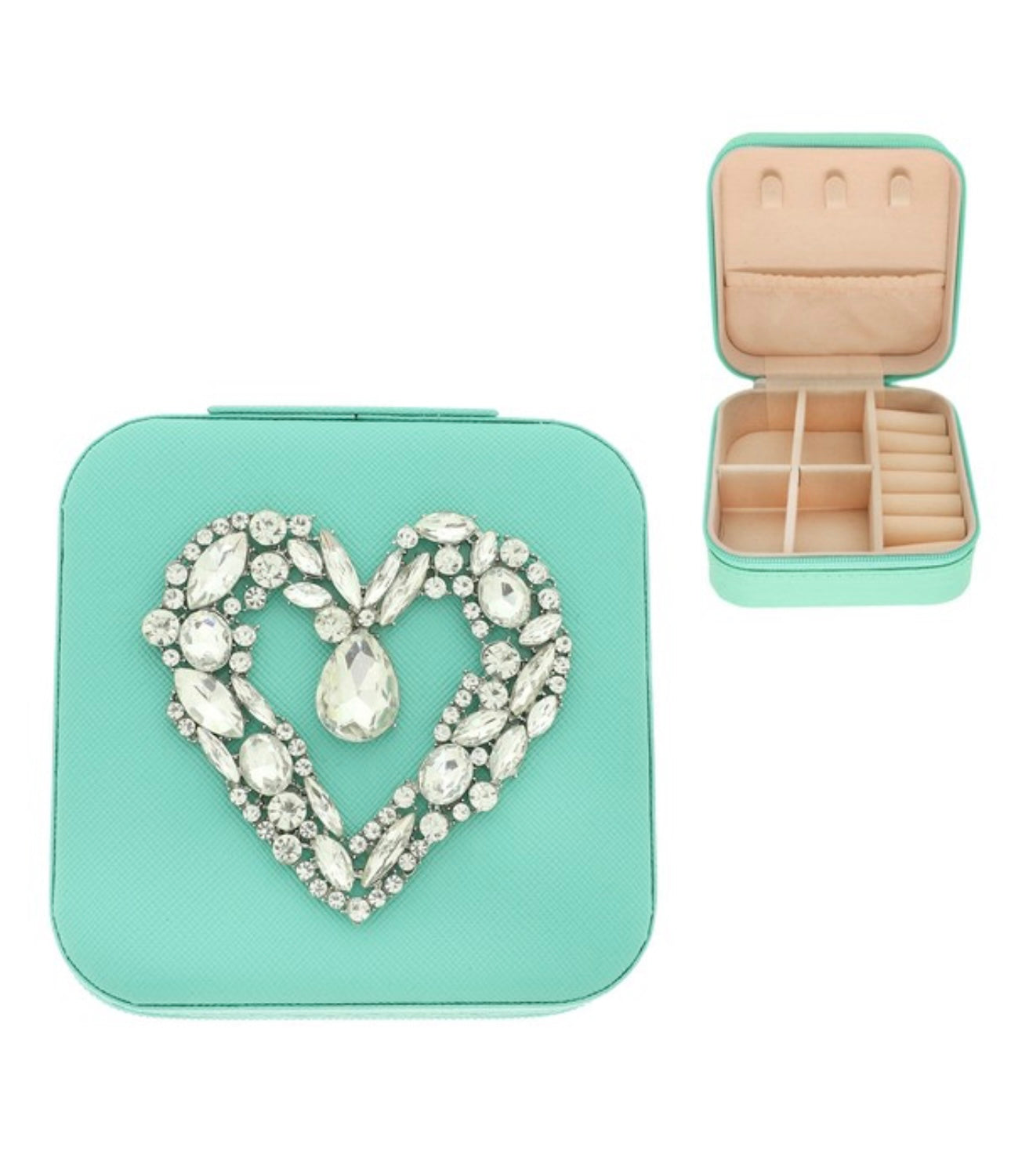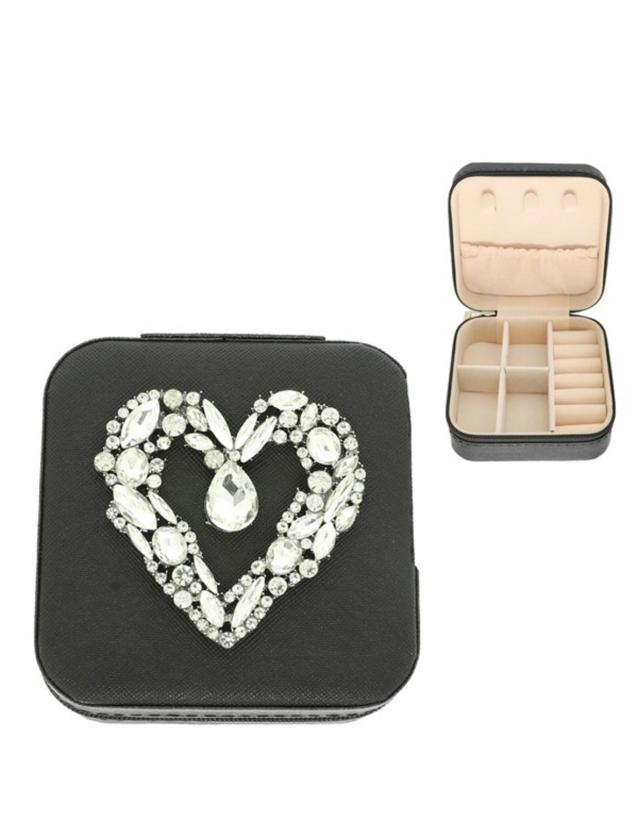 Heart crystal embellished travel jewelry box with multiple compartments!