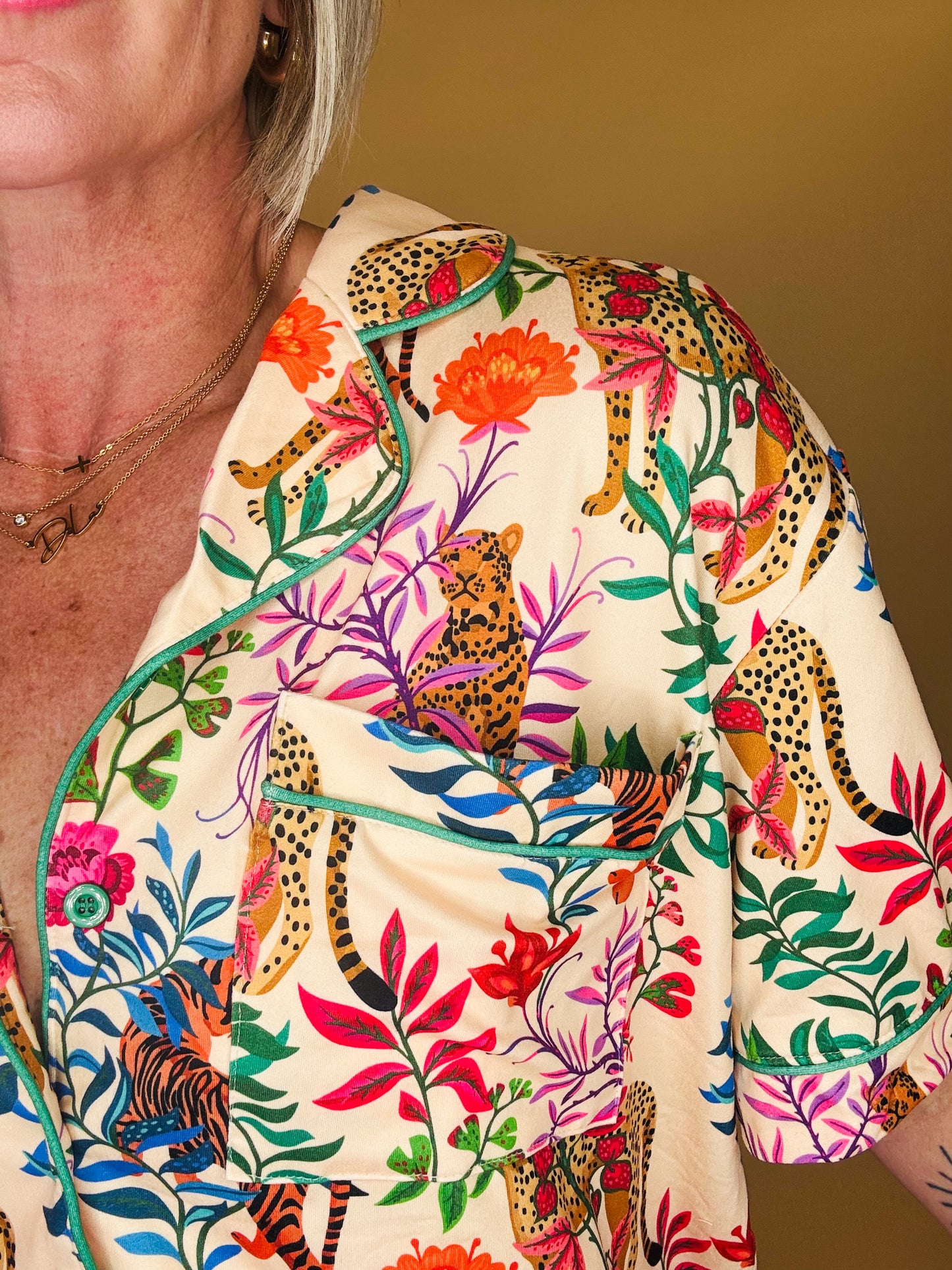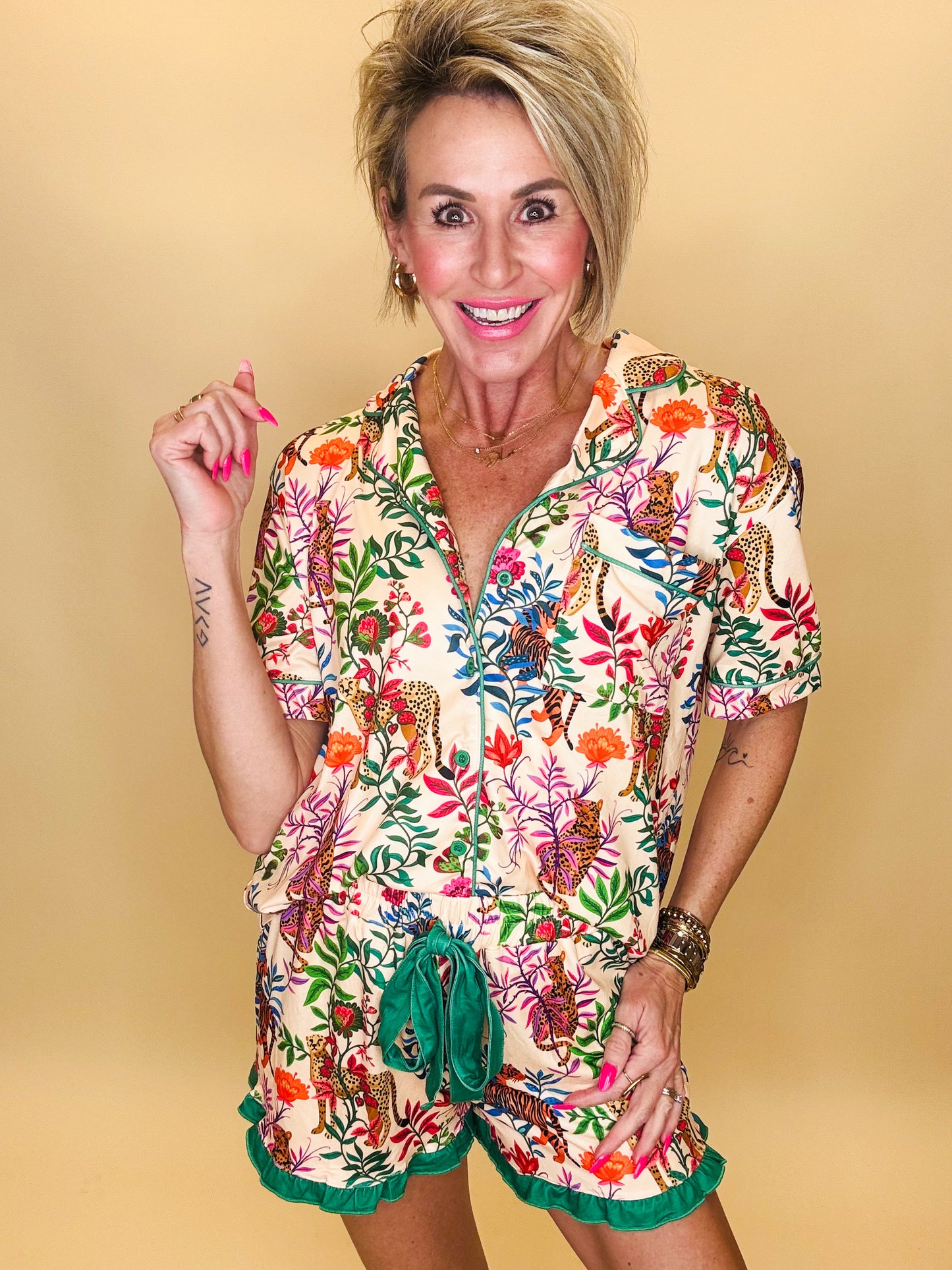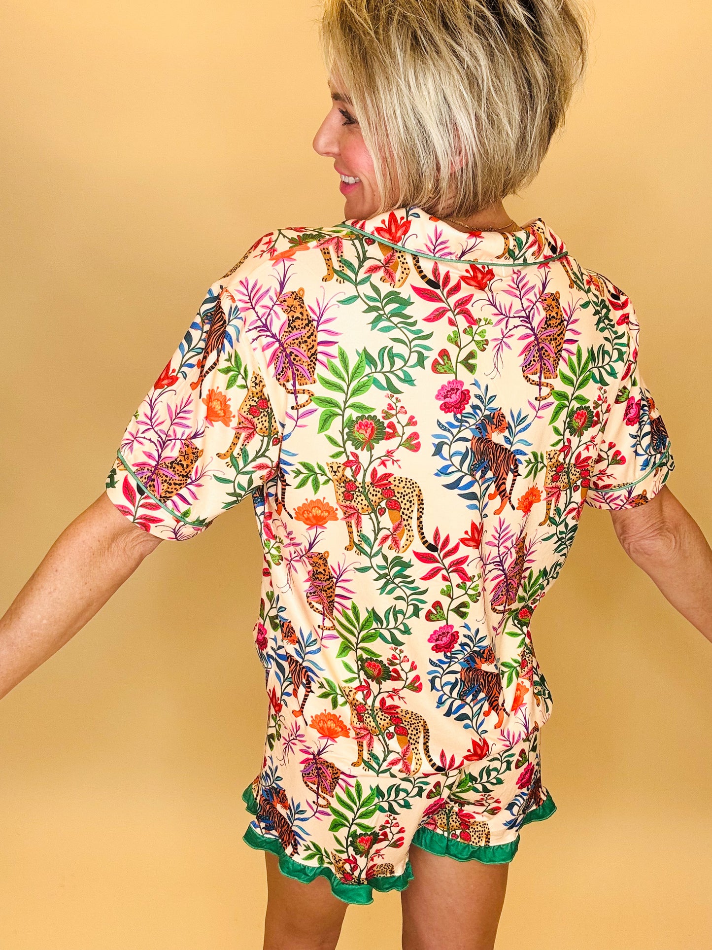Fun, flirty, and made for cozy nights, this two-piece pajama set features a vibrant jungle-inspired print with playful leopards, florals, and lush greenery. The short-sleeve button-front top offers a relaxed, comfortable fit, while the coordinating shorts include a stretchy elastic waistband and adjustable tie for easy wear. Finished with contrast trim for a polished touch, this lightweight set is perfect for lounging, sleepovers, or adding a little extra fun to your bedtime routine.