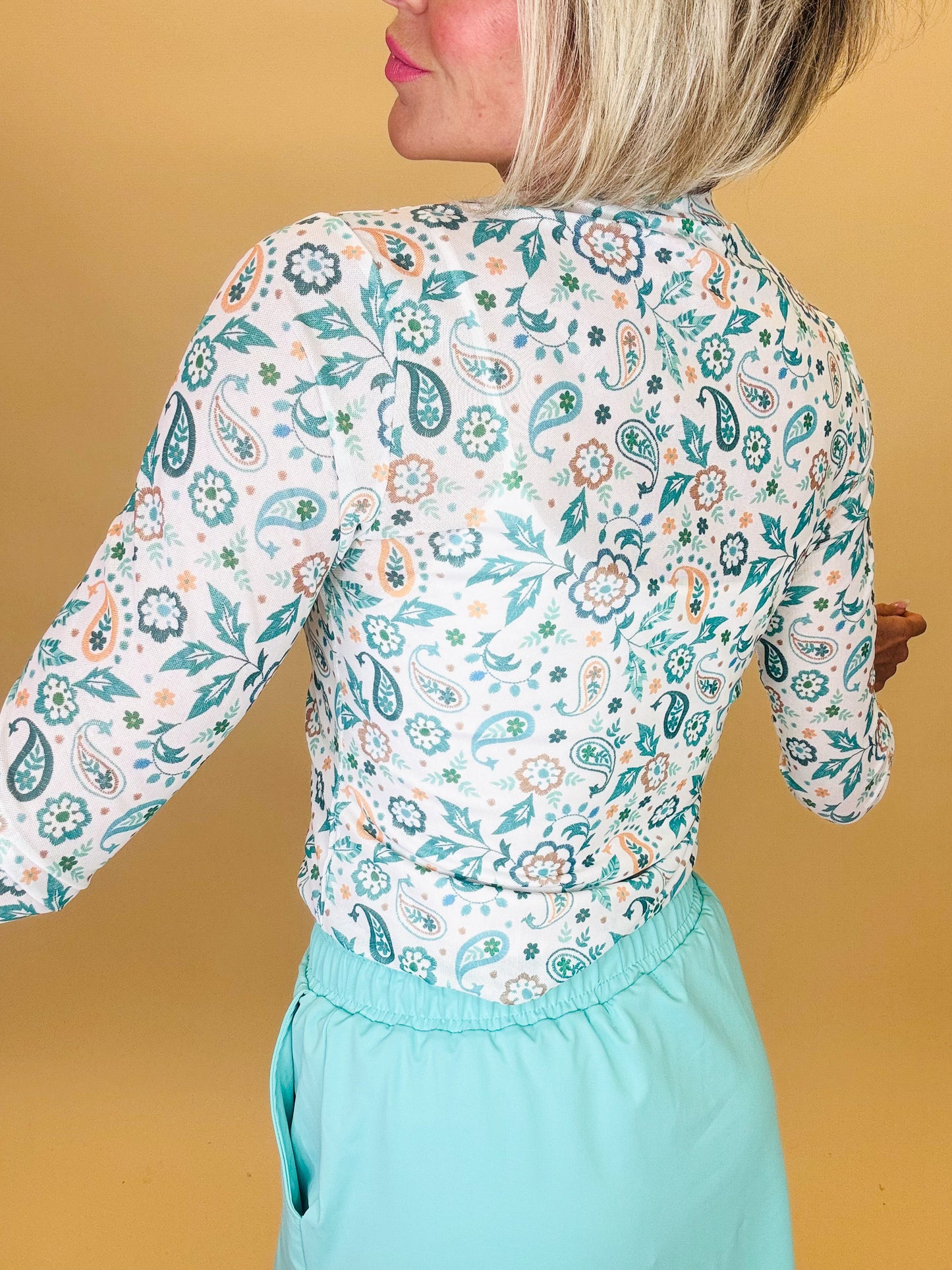 This fitted long sleeve mesh top features a soft mesh feel with a delicate paisley and floral print in dreamy shades of sage, teal, and soft peach. Lightweight and stretchy, it hugs comfortably without feeling restrictive, making it perfect for layering or wearing on its own.