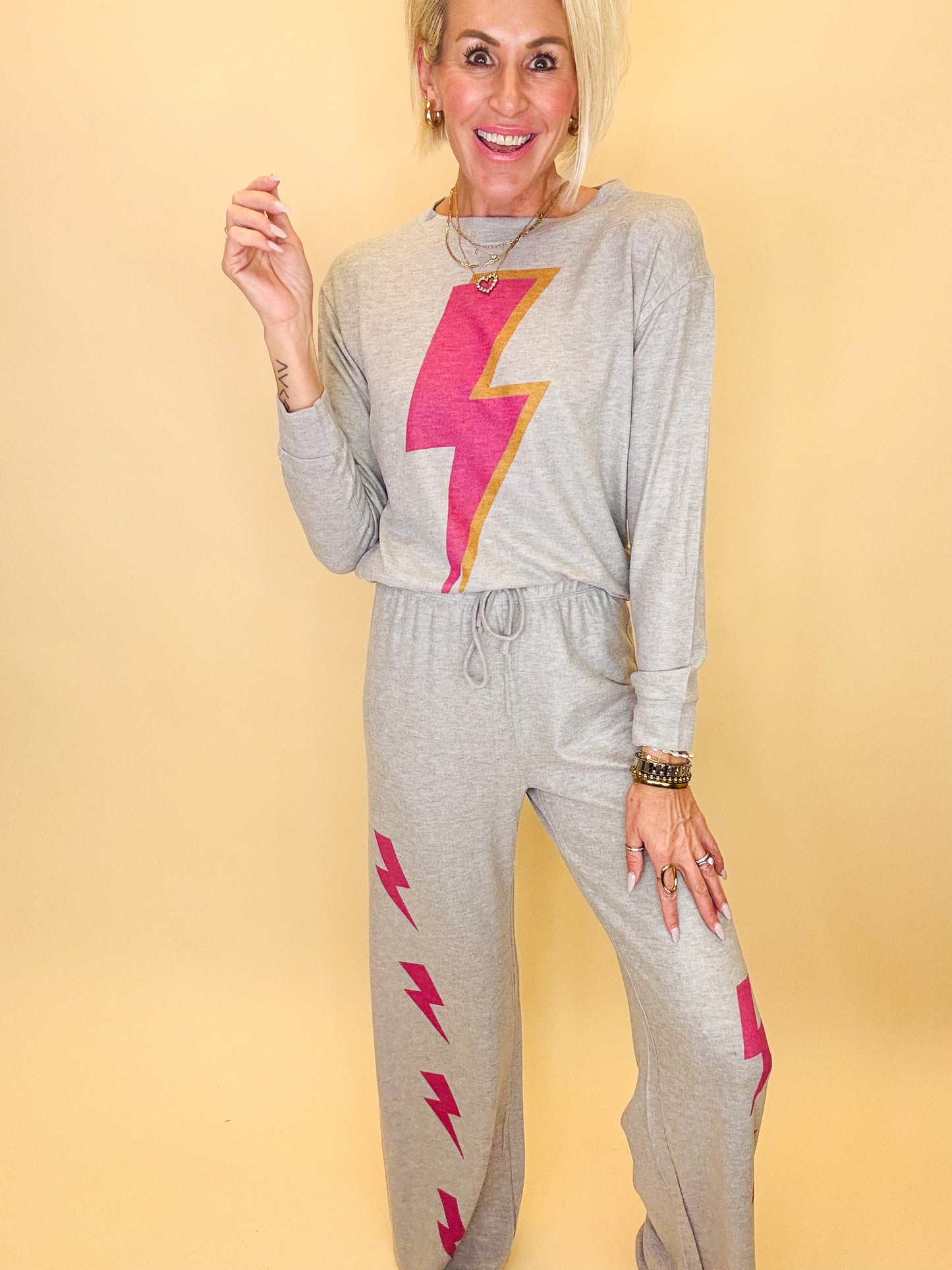Strike a pose in the Lightning Lounge Set, the perfect mix of cozy comfort and high-energy style. Featuring a vibrant lightning bolt graphic on the top and matching bolt accents down each pant leg, this set brings all the bold, confident, feel-good vibes.