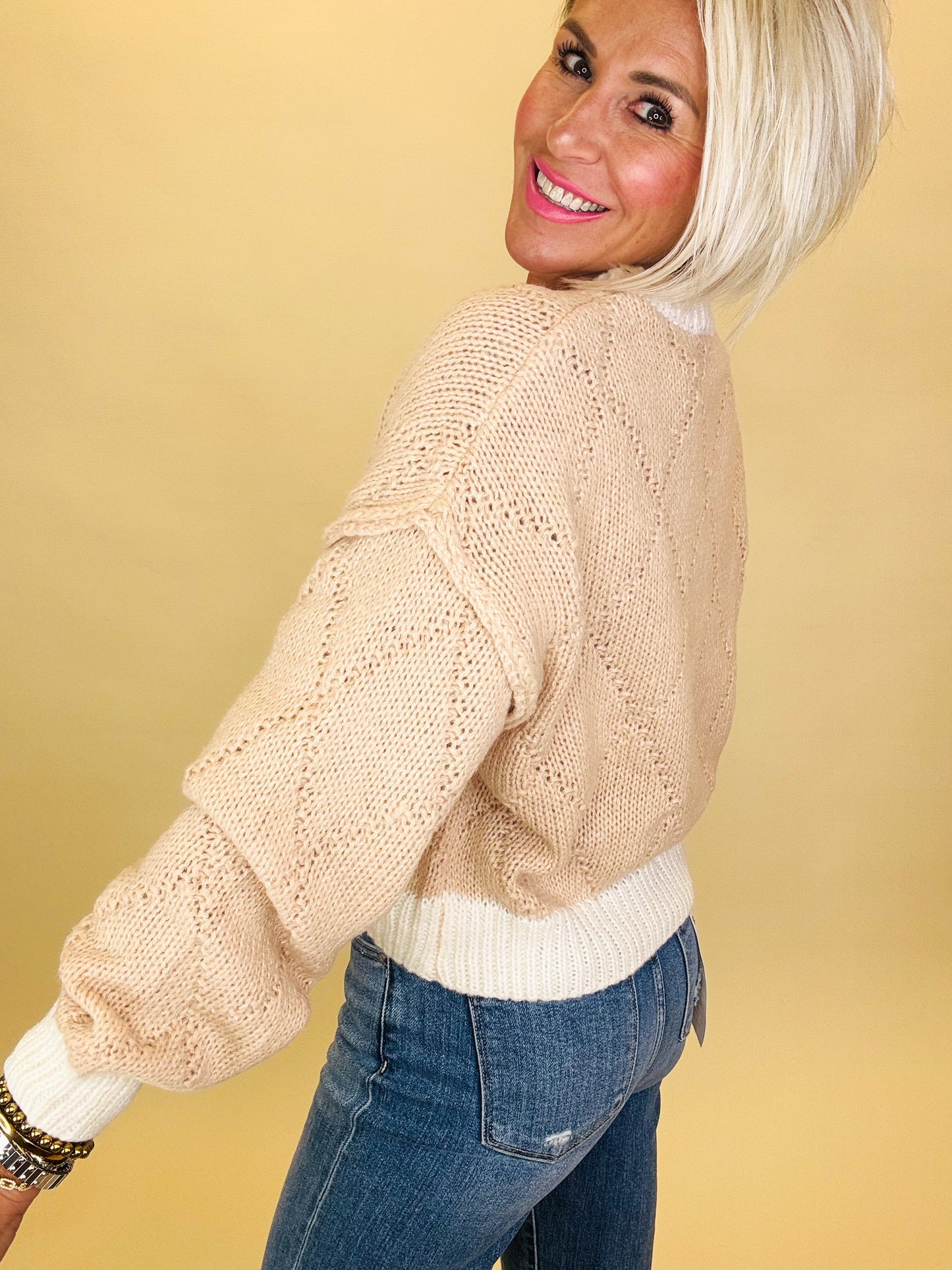 Cozy meets elevated in this textured knit sweater featuring a crew neckline, full-length slight bubble style sleeves, and a semi crop hem. Chunky knit adds dimension and charm while the soft, medium-weight fabric keeps you warm without bulk. An easy go-to for layering or wearing on its own — comfy, cute, and endlessly wearable.