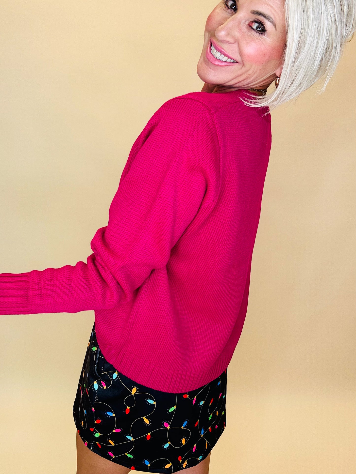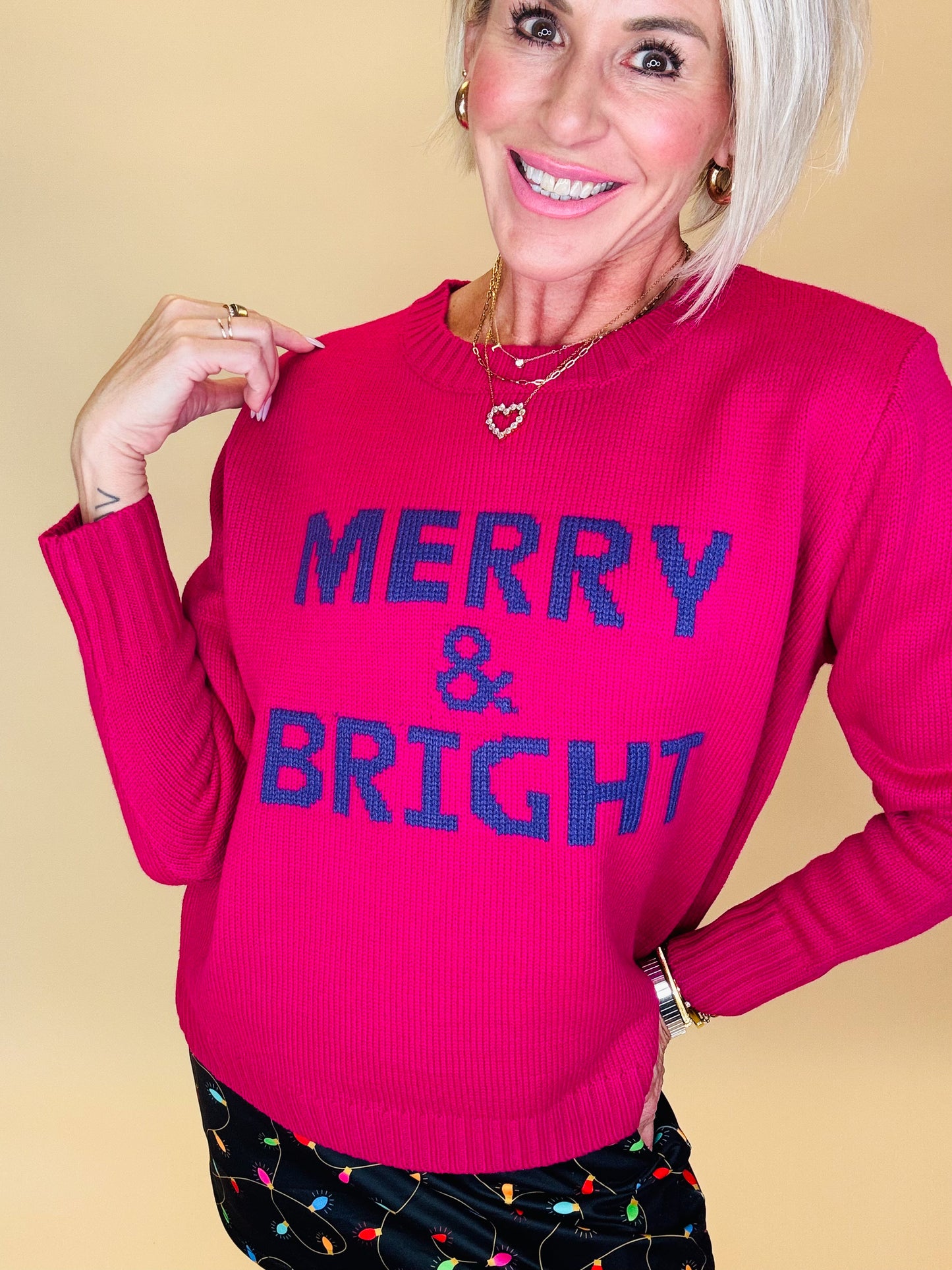 Bring the cheer with a little attitude in this bold and cozy Merry & Bright Sweater. Featuring a vibrant magenta & blue with playful lettering, this festive pullover is made for the girl who lights up every room—holiday party or not. The relaxed fit and soft, comfy feel make it perfect for pairing with jeans, leggings, or your favorite festive accessories. Fun, fearless, and full of holiday magic, it’s the statement sweater your season’s been waiting for.