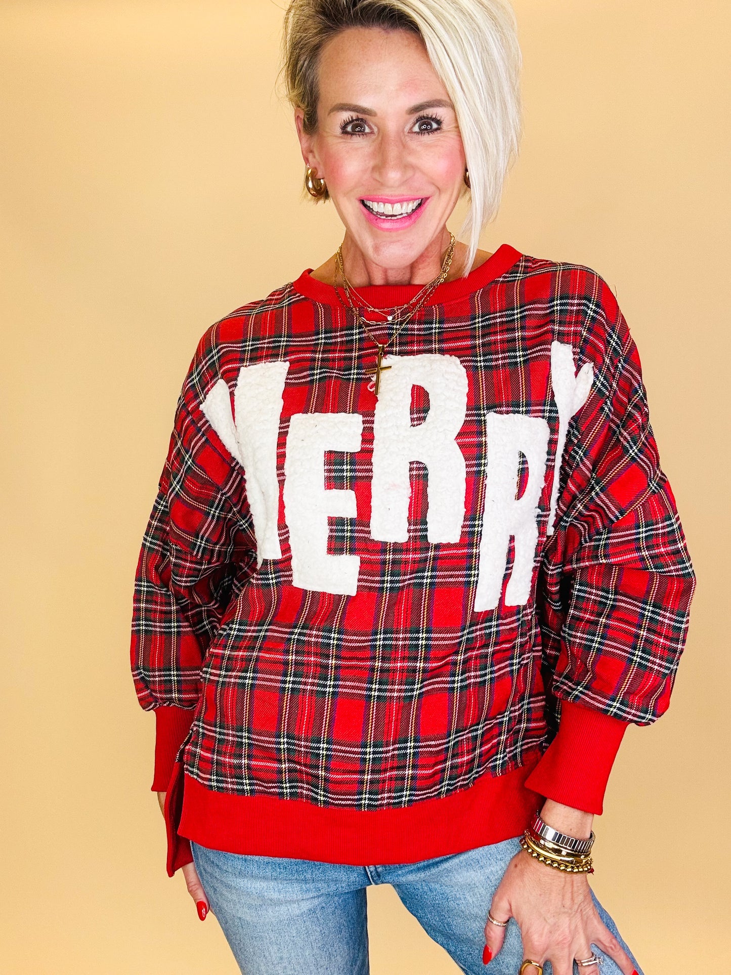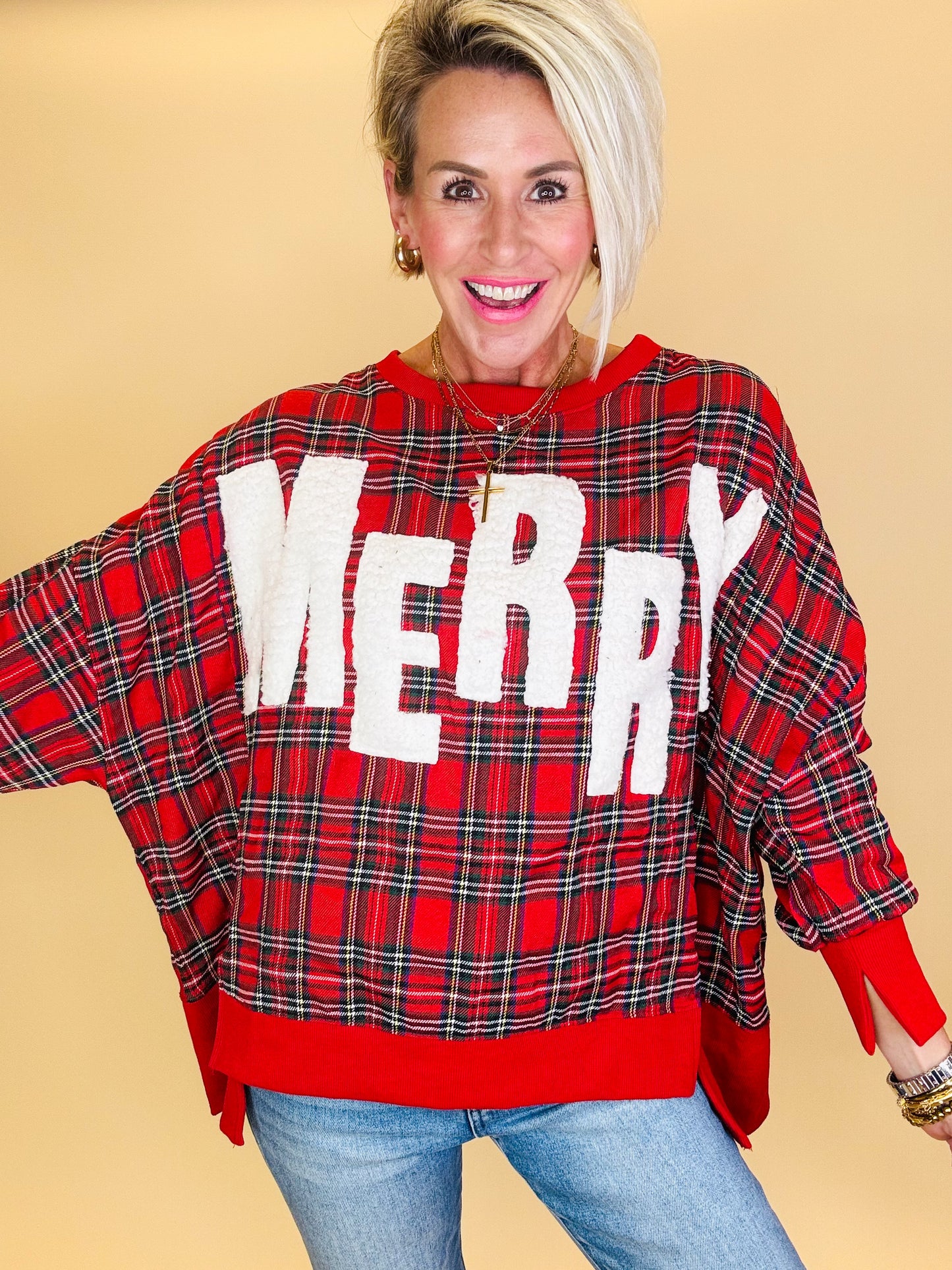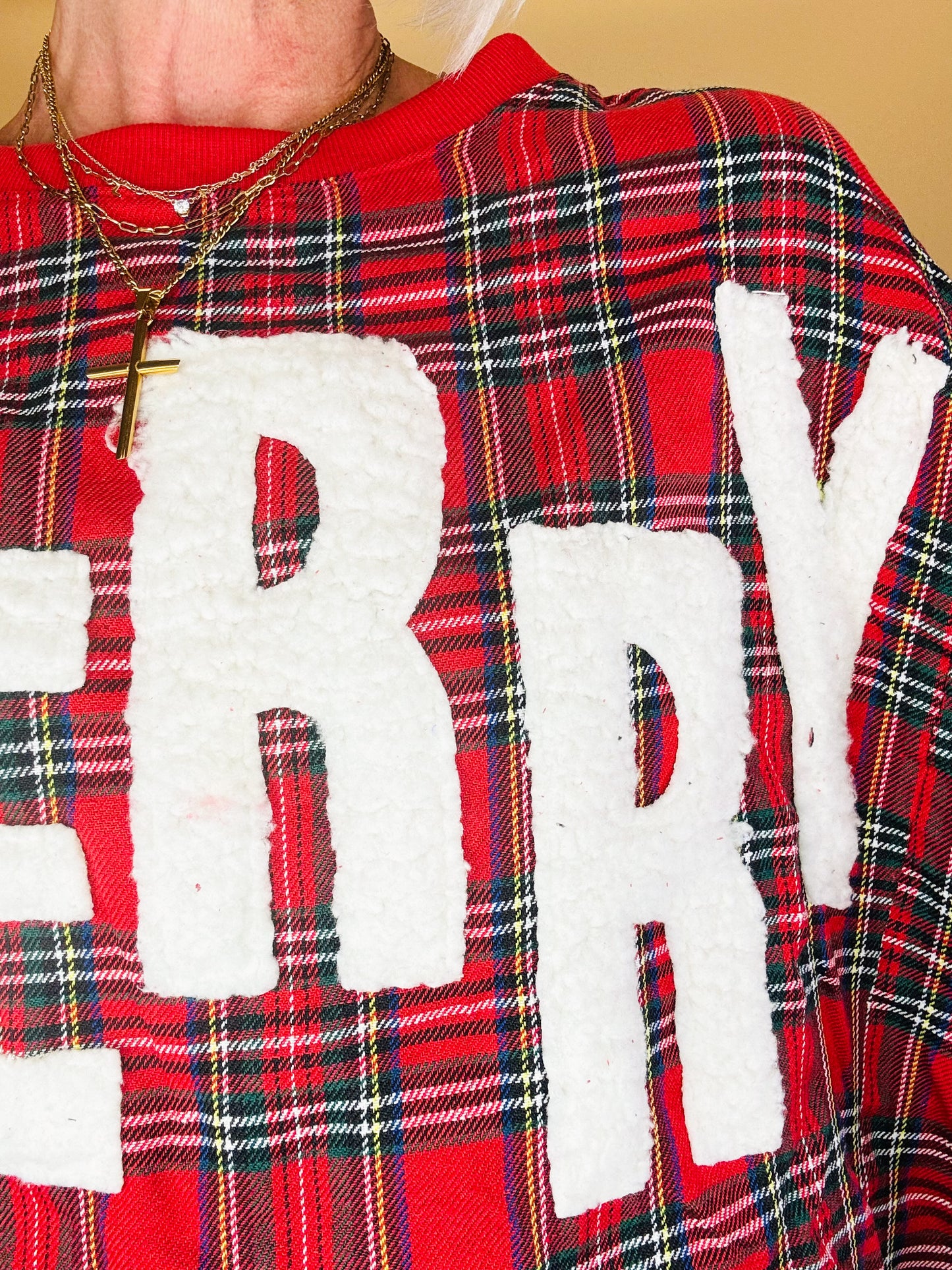Stay merry and bright in this holiday-ready plaid pullover, featuring bold sherpa-textured MERRY lettering across the front. With its classic red tartan print, cozy fleece details, and relaxed fit, this sweatshirt is perfect for everything from holiday shopping trips to fireside lounging. A festive blend of comfort and cheer, it’s the ultimate go-to piece for spreading Christmas spirit in style.