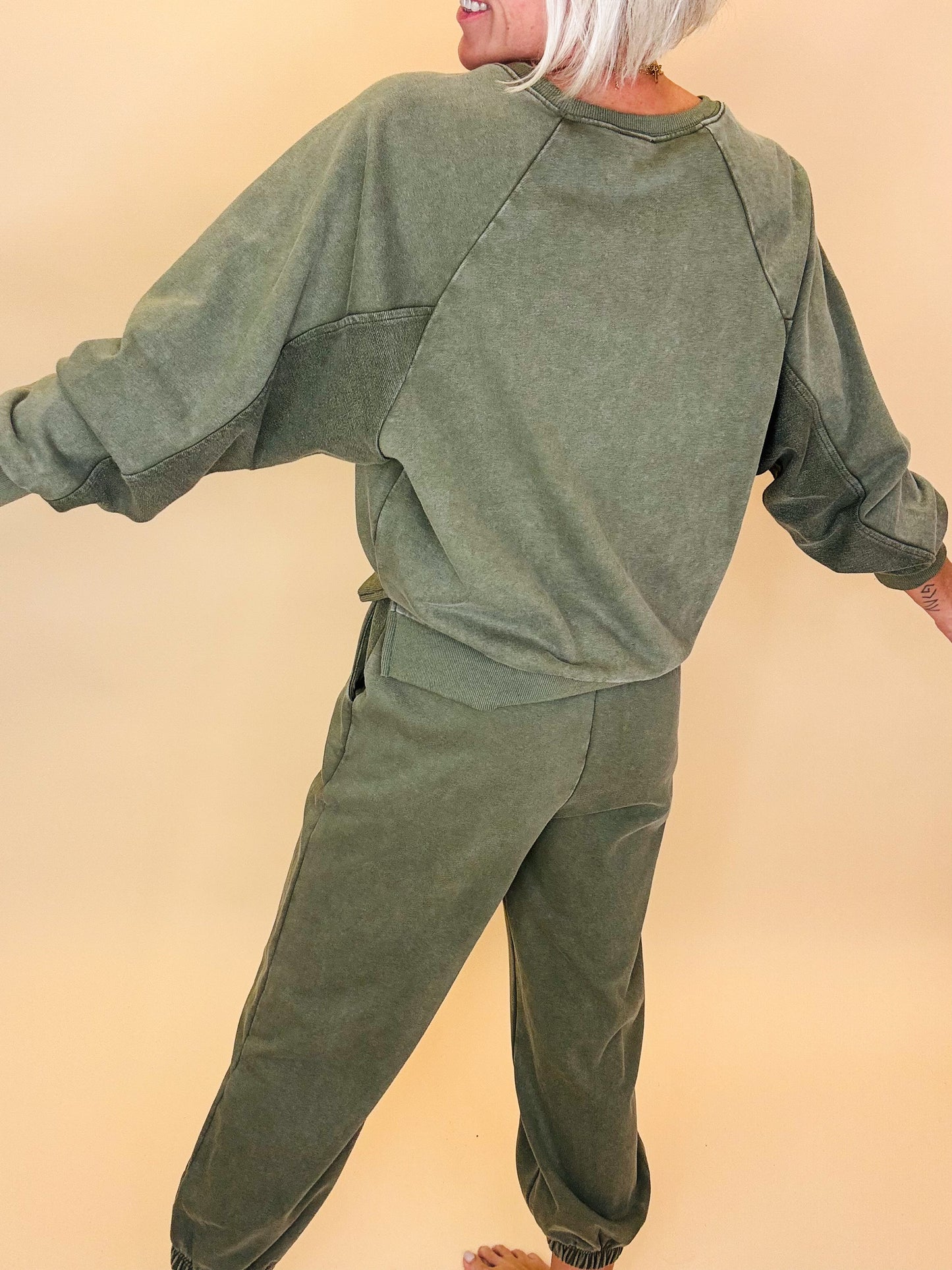Comfy never looked this cool. This washed olive lounge set features a relaxed crewneck sweatshirt and matching joggers with an effortlessly lived-in vibe. Designed with a mineral wash finish, it gives that perfect vintage edge while staying soft and cozy for everyday wear. Whether you’re lounging at home, running errands, or grabbing coffee with friends, this set is your go-to for laid-back style with a trendy twist.