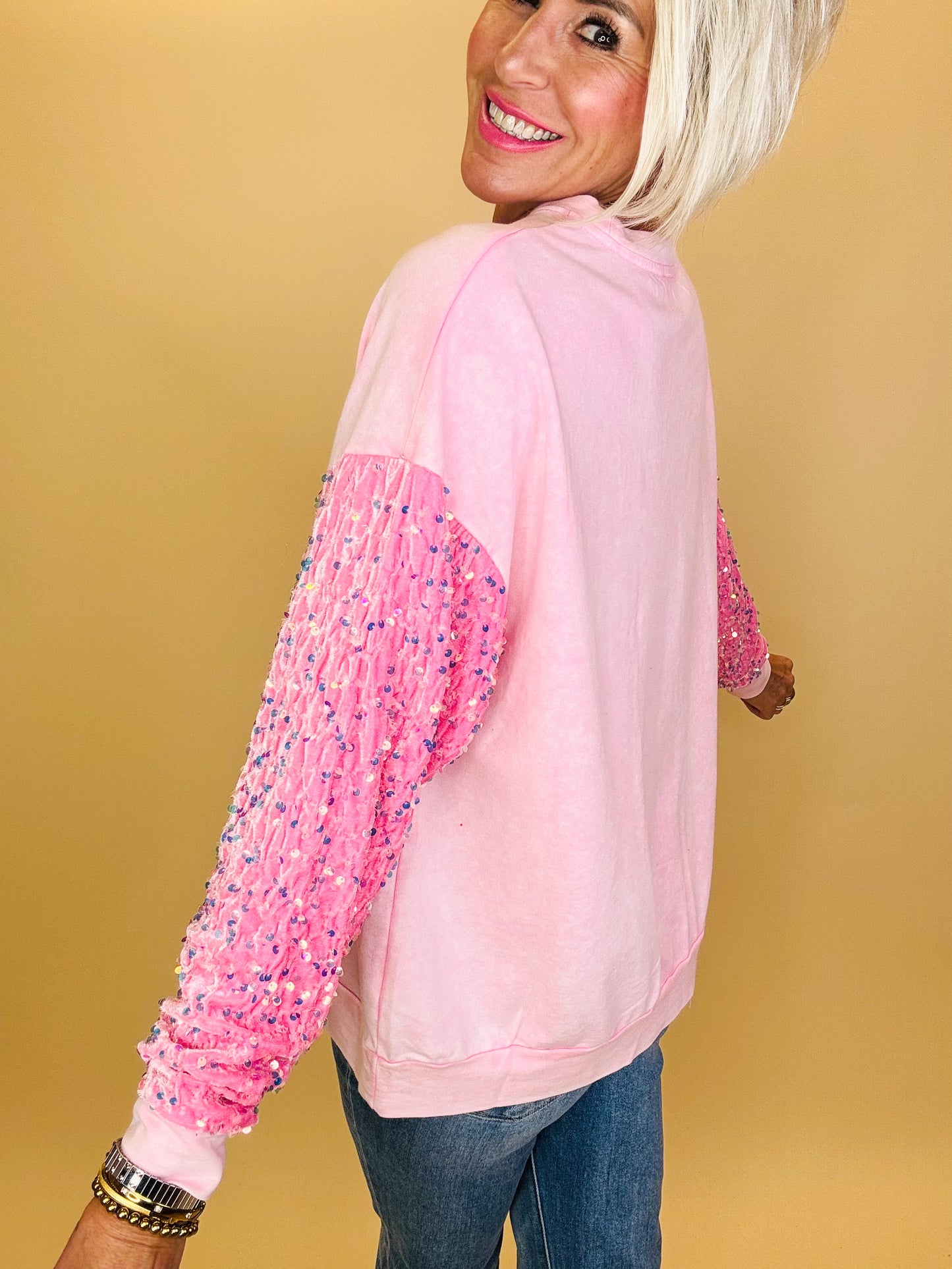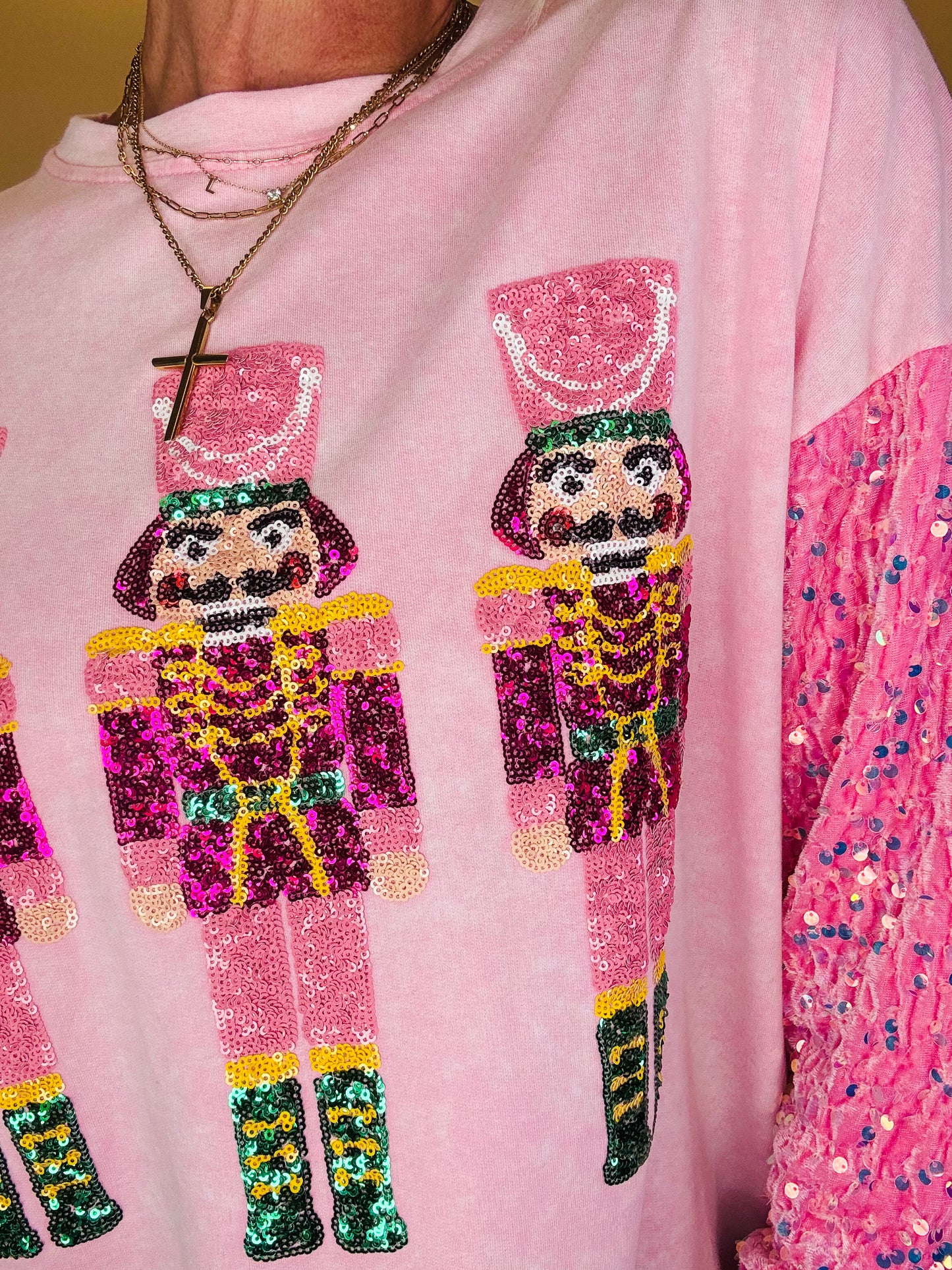 Step into holiday magic with this playful pink sweatshirt, featuring three dazzling nutcrackers across the front and sequin-adorned sleeves that shimmer with every move. The mix of festive sparkle and cozy comfort makes it the perfect piece for everything from holiday parties to casual Christmas movie nights. Sweet, fun, and eye-catching—this sweatshirt is a must-have for anyone who loves a little glam with their holiday cheer.