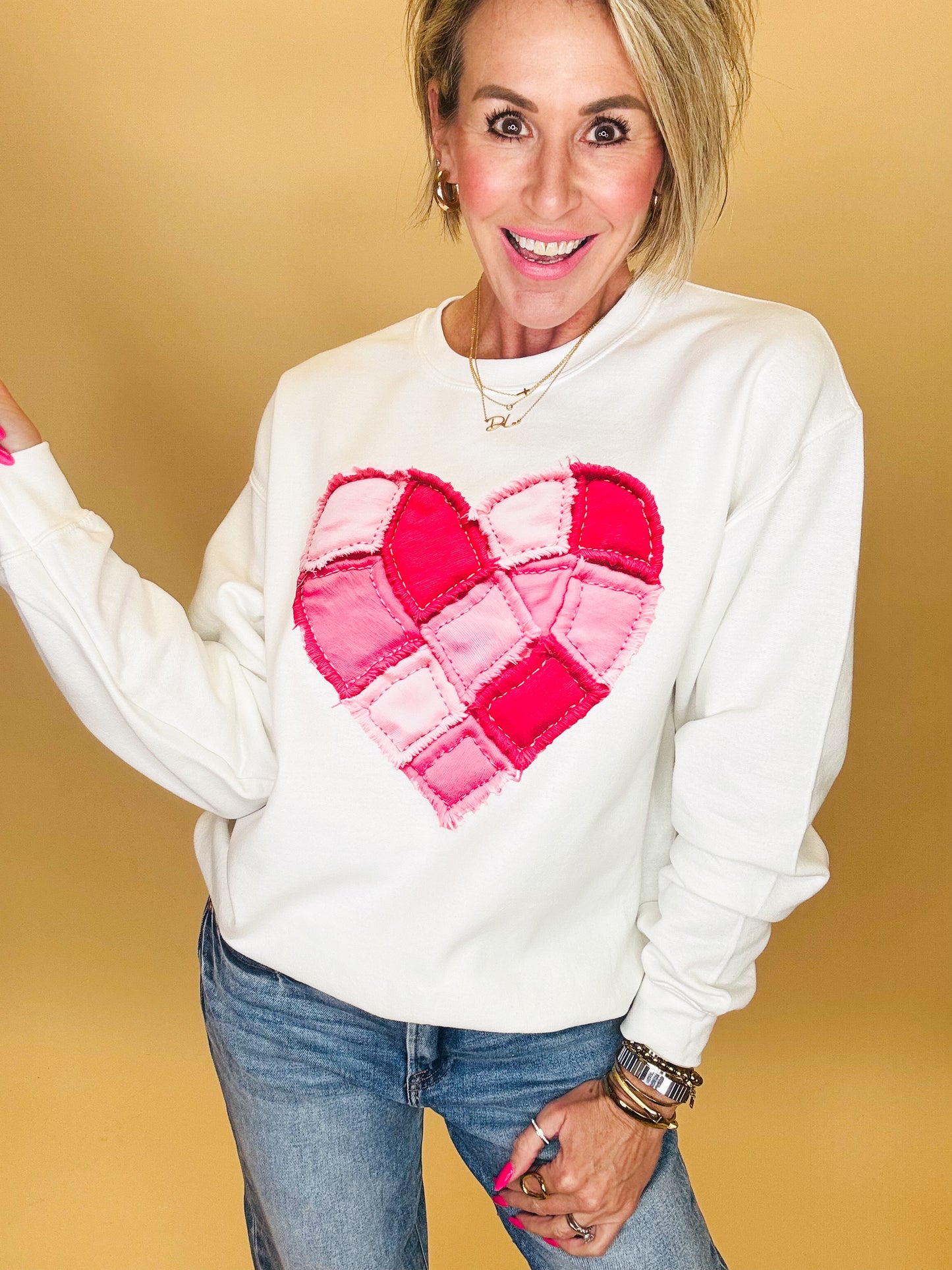 Sweet meets cozy in this must-have spring sweatshirt. Featuring a charming patchwork heart design in soft pink tones, this pullover brings a playful, handmade feel to an everyday favorite. Crafted from a comfy, lightweight fleece blend with a relaxed fit, it’s perfect for cool spring mornings, casual days, and layering through the season. Pair it with denim, leggings, or cutoffs for an effortlessly cute look you’ll reach for again and again.