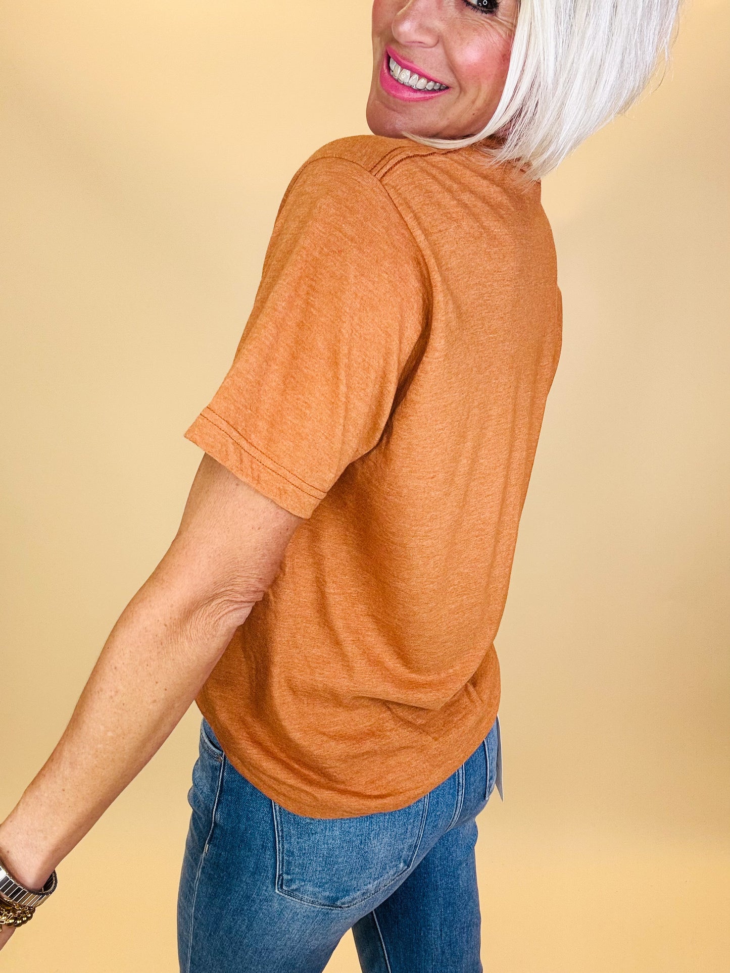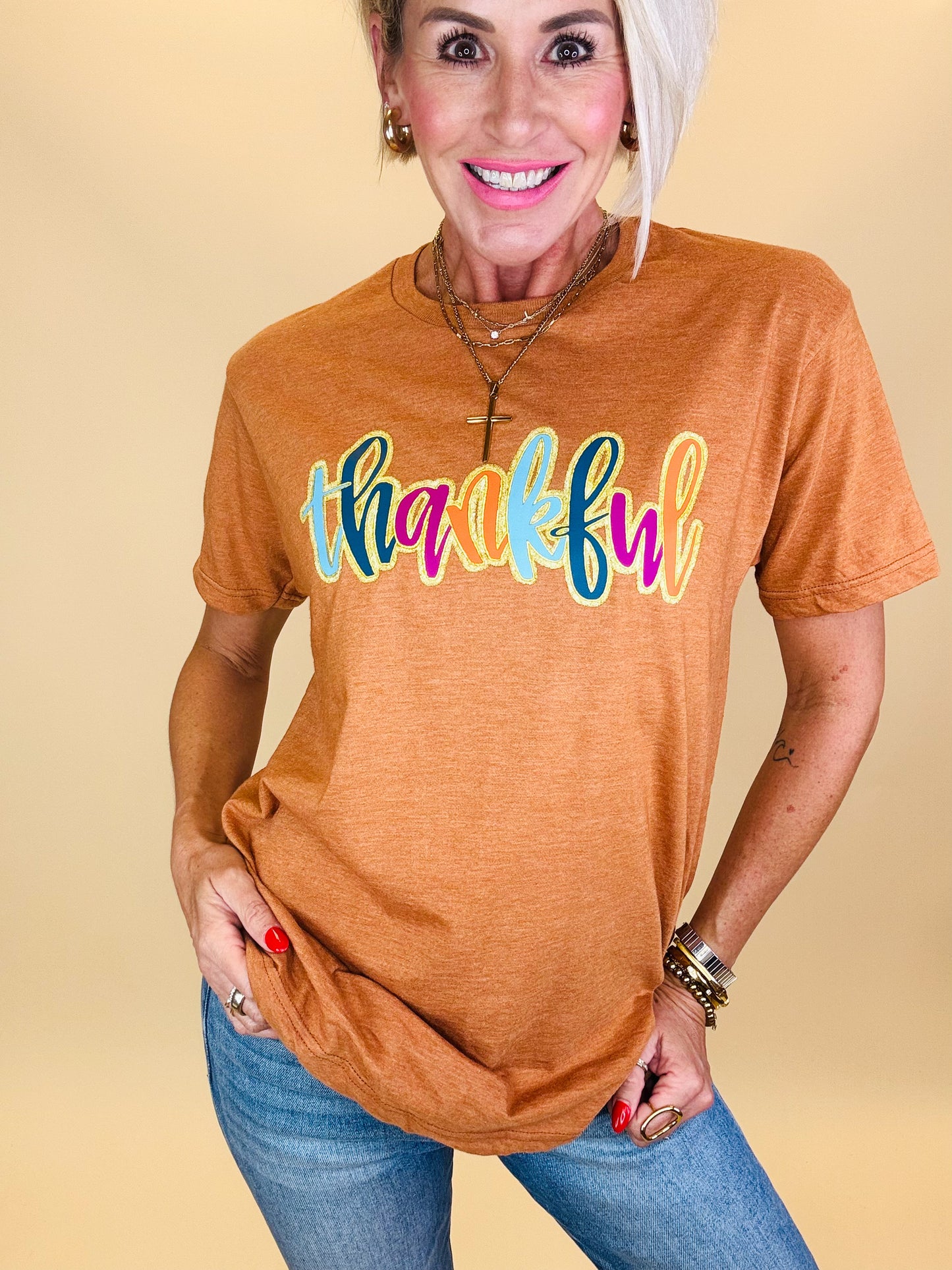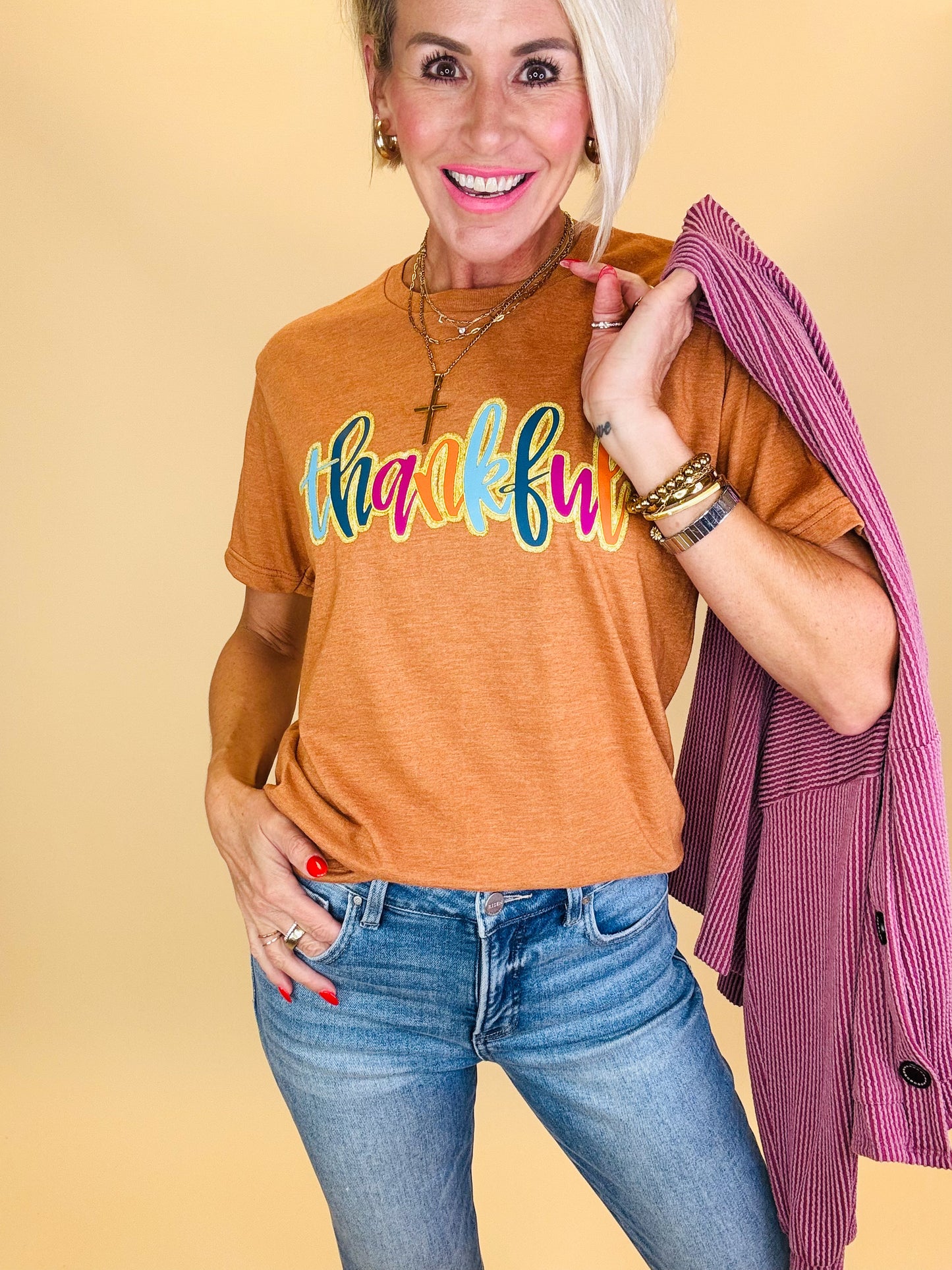 Celebrate gratitude in style with this cozy Thankful graphic tee. Crafted in a warm, autumn-inspired rust hue, it features a bold multicolor script outlined in shimmering gold for the perfect festive pop. Soft, lightweight, and effortlessly casual, this tee is ideal for layering under a cardigan or wearing on its own during fall gatherings, Friendsgiving, or Thanksgiving dinner. A cheerful reminder of the season, it’s a feel-good piece you’ll love reaching for year after year.