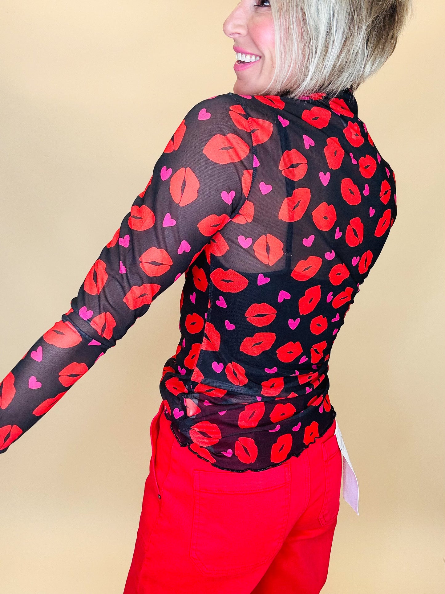 Turn up the charm with this flirty sheer mesh top, featuring an allover kiss and heart print in bold red and pink tones. Designed with a lightweight, stretchy feel and a fitted silhouette, it’s perfect for layering over a cami or under jackets for a playful pop. Dress it up with denim and heels or keep it casual with sneakers for a look that’s fun, confident, and full of love.