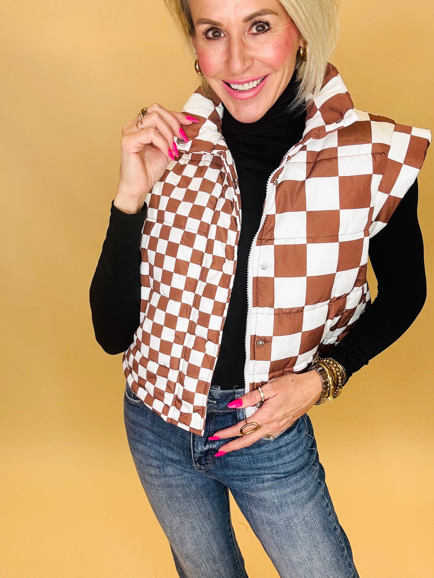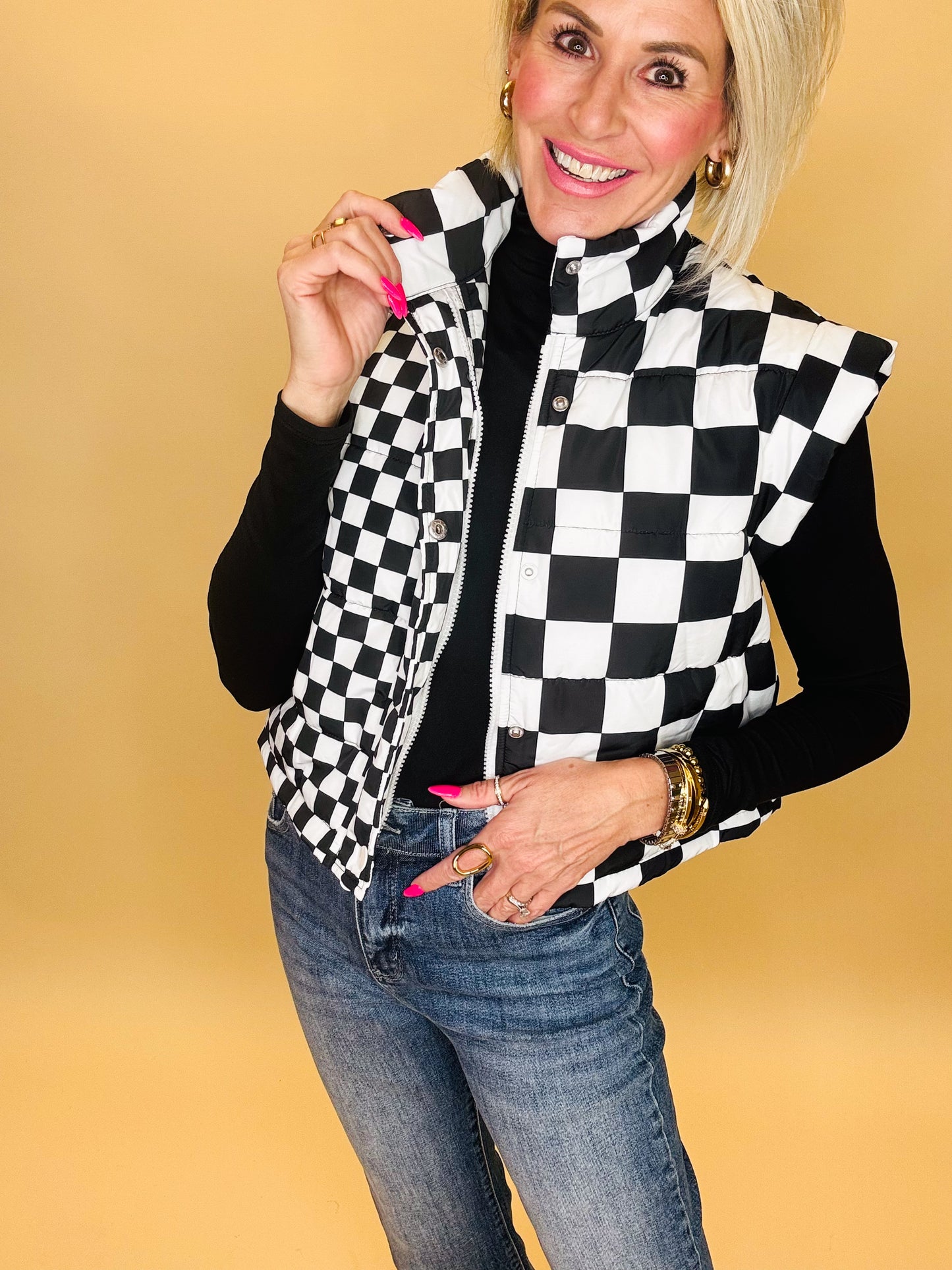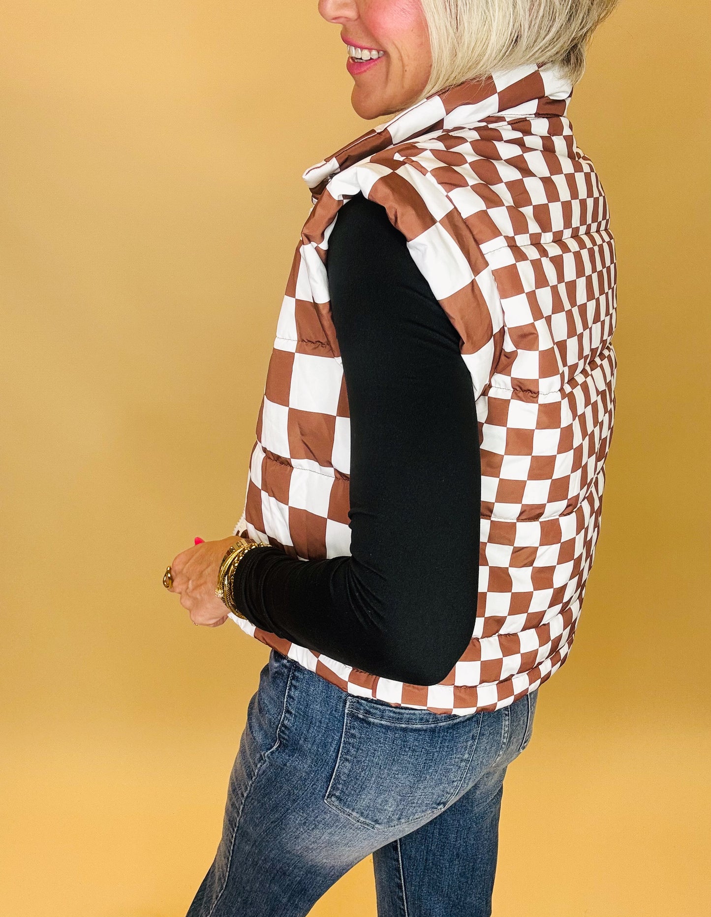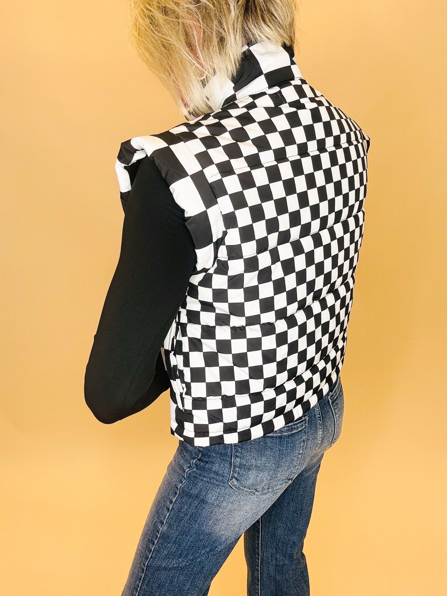 The Ready, Set, Check Vest is your go-to layer for cool mornings and bold styling. With its quilted checkerboard design, structured collar, and flattering fit, this vest brings just the right mix of sporty and chic. Pair it with denim, joggers, or leggings for an effortlessly styled look.