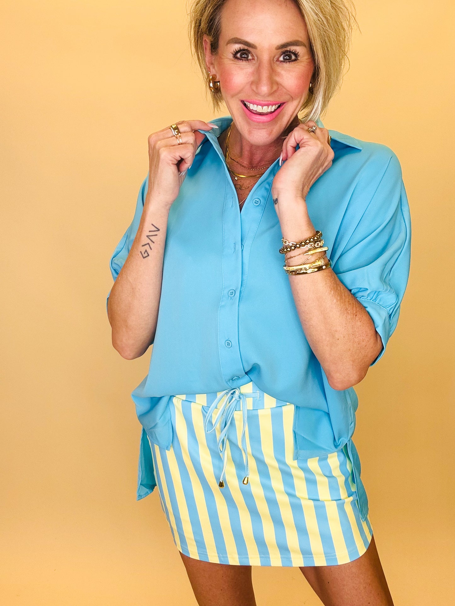 Get ready to turn heads with the Sorrento Stripes Skort! This playful piece showcases blue and yellow vertical stripes that instantly elevate your warm-weather wardrobe. The breathable fabric keeps you cool and comfortable, while the stretchy back waistband and built-in shorts provide the perfect blend of style and coverage. Practical side pockets and an adjustable drawstring means you're always ready for whatever the day brings.