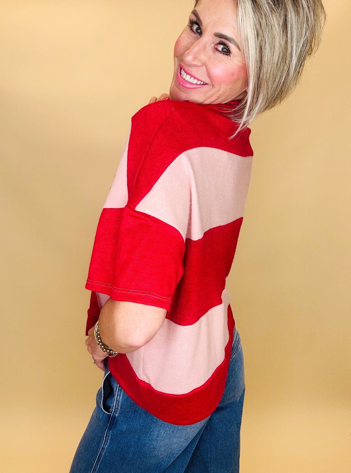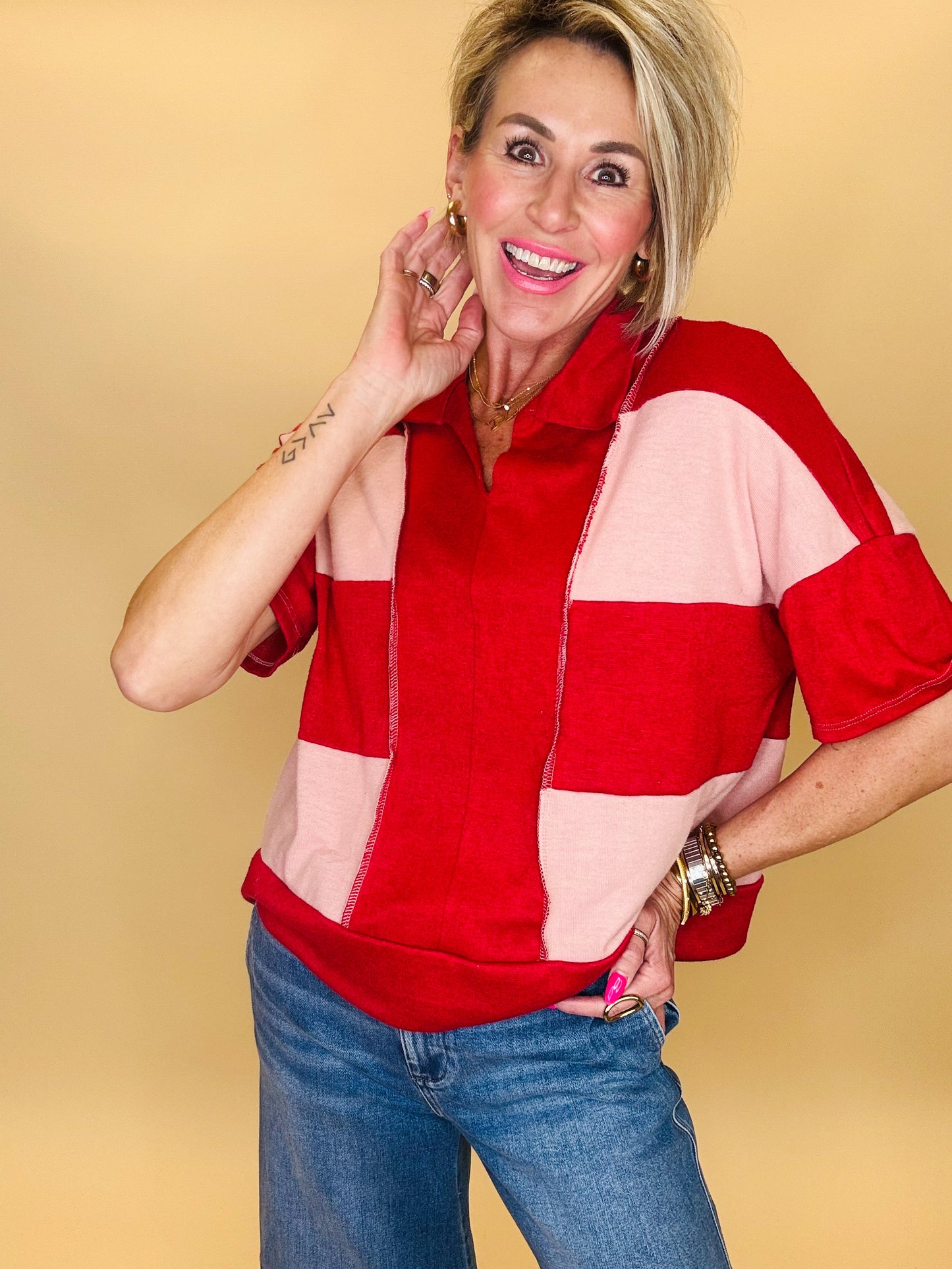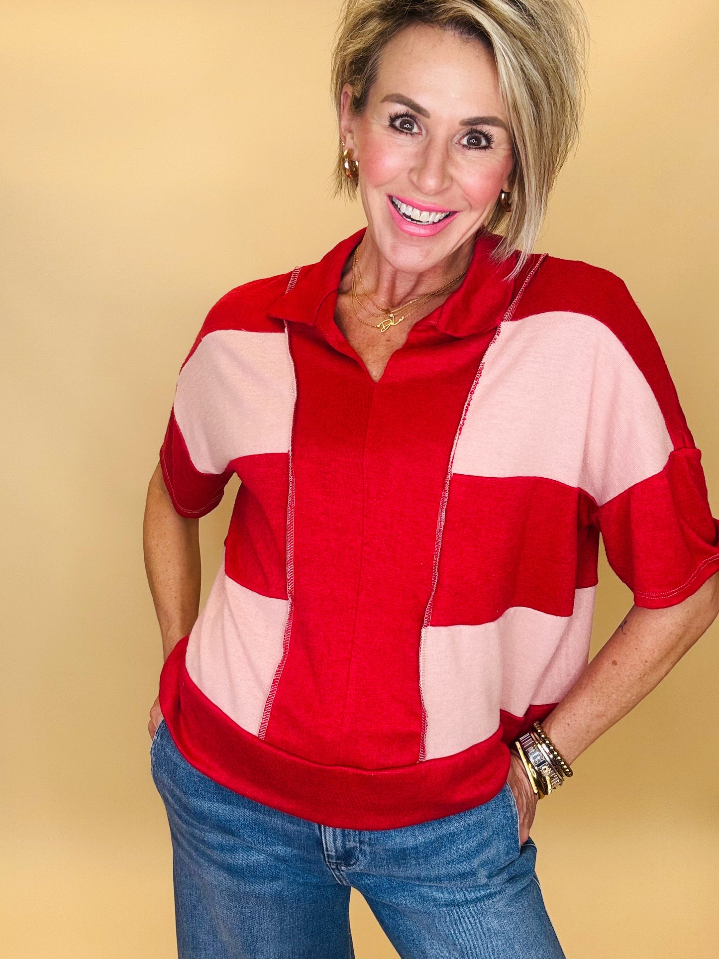 A playful nod to spring days, this striped top blends sporty charm with boutique flair. Featuring a relaxed cropped fit, soft lightweight knit, and classic collar neckline, it’s perfect for pairing with denim, skorts, or joggers. Easy, breathable, and effortlessly cute for sunshine-filled days.