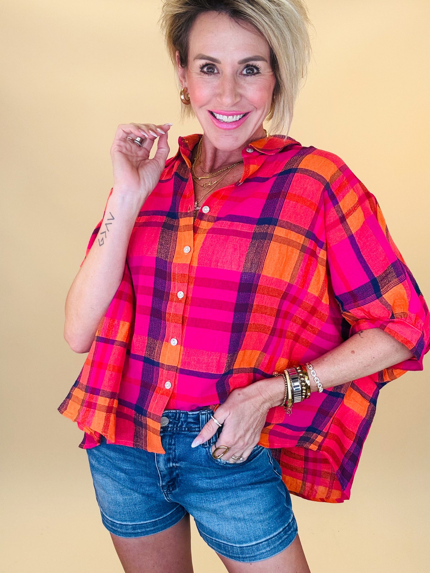 Bright, bold, and made to turn heads — the Sunset Pop Plaid Top is the perfect statement piece for sunny days. Featuring vibrant pink and orange plaid, a relaxed flowy silhouette, and a classic button-front design, this lightweight top brings effortless style with a playful twist. The breezy fit and soft fabric make it perfect for warm weather while the eye-catching colors add instant personality to any outfit. Pair it with your favorite denim shorts or white jeans for a fun, standout look.