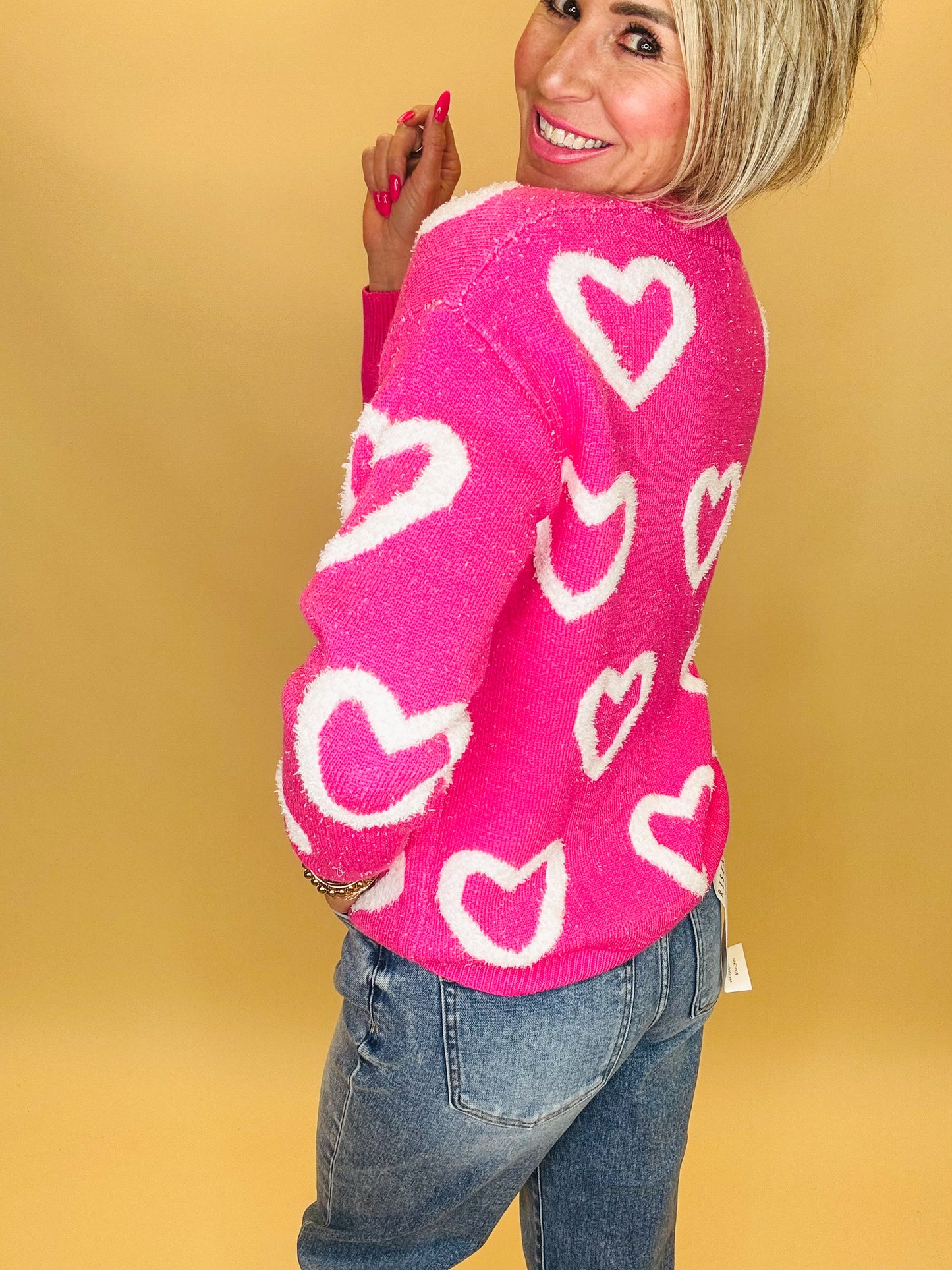 Say hello to instant happy vibes. The Sweet & Chic Hearts Sweater features a vibrant pink knit base adorned with soft white heart details for a playful yet polished look. Designed with a lightweight feel and relaxed fit, this sweater is perfect for those crisp spring mornings and breezy evenings. Easy to style with denim, white jeans, or layered over dresses, it’s the kind of feel-good piece that brings charm to every outfit.