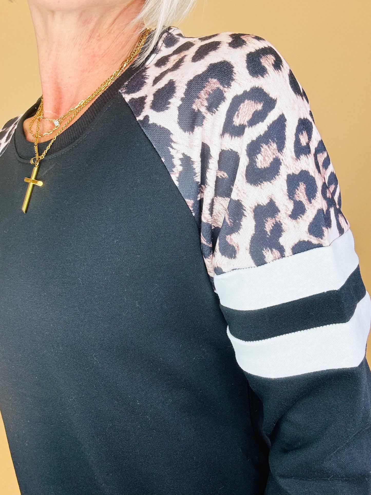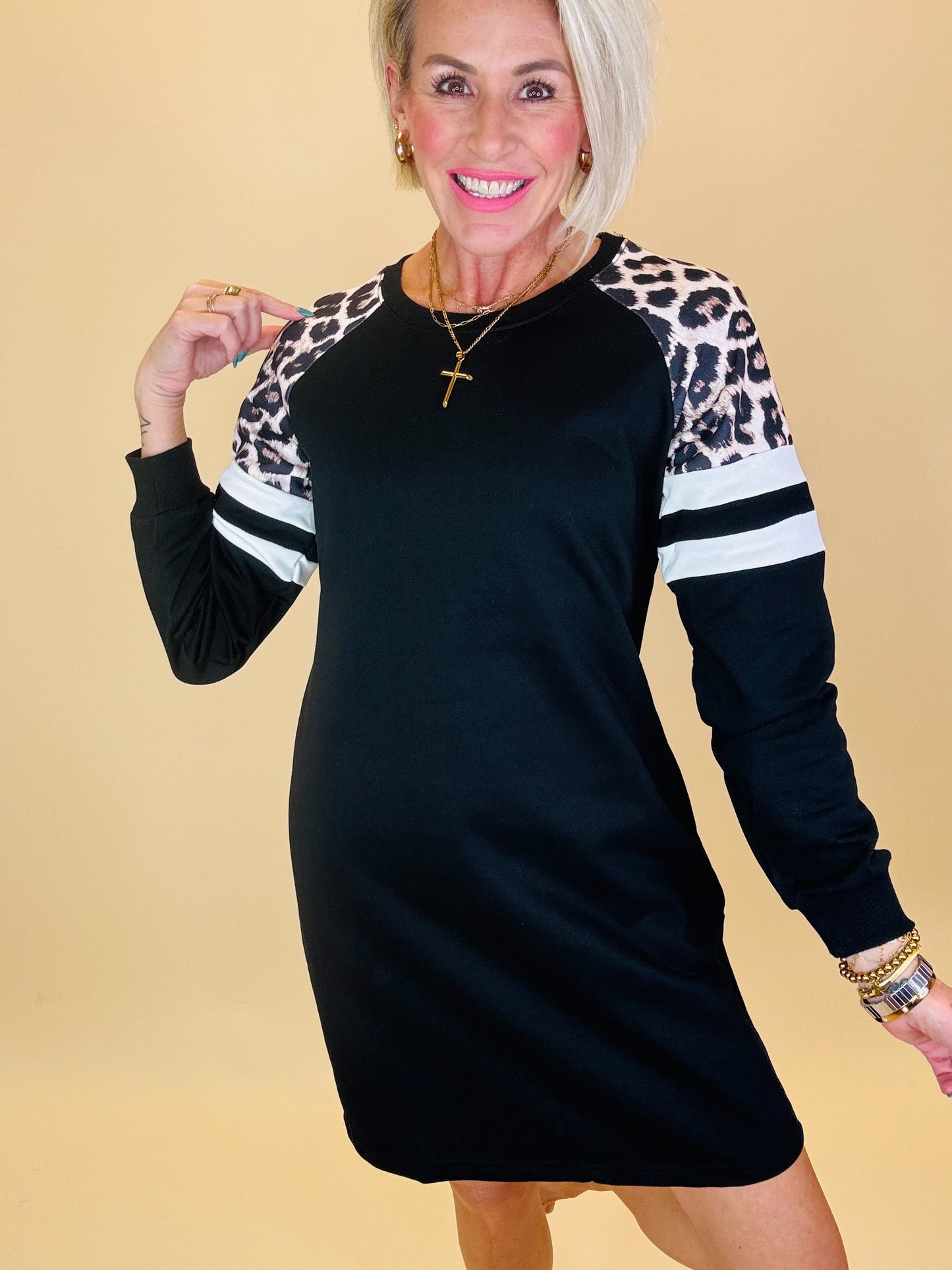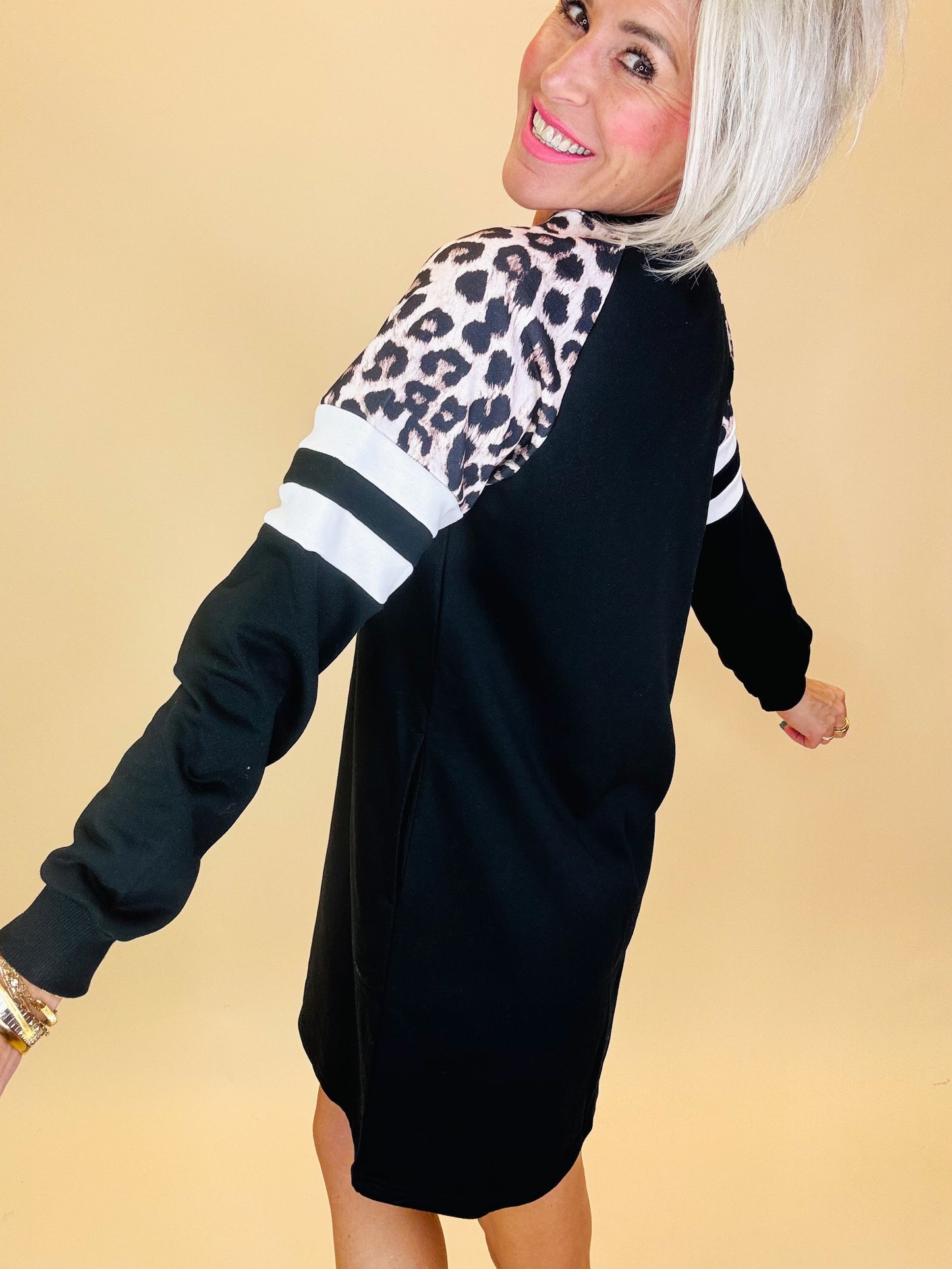Sporty meets sassy in our Wild Streak Sweatshirt Dress! This effortlessly chic black dress features bold leopard print shoulder panels and double white sleeve stripes for that perfect mix of fierce and fun. Designed with a soft, comfy fabric and an easy pullover fit, it’s ideal for casual days that still call for a touch of attitude.