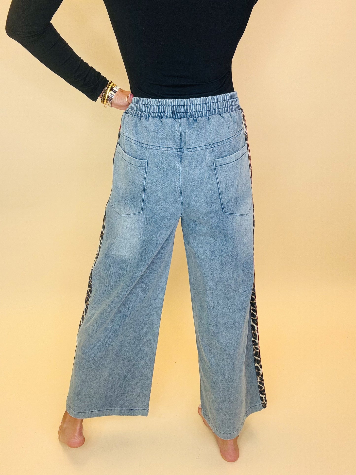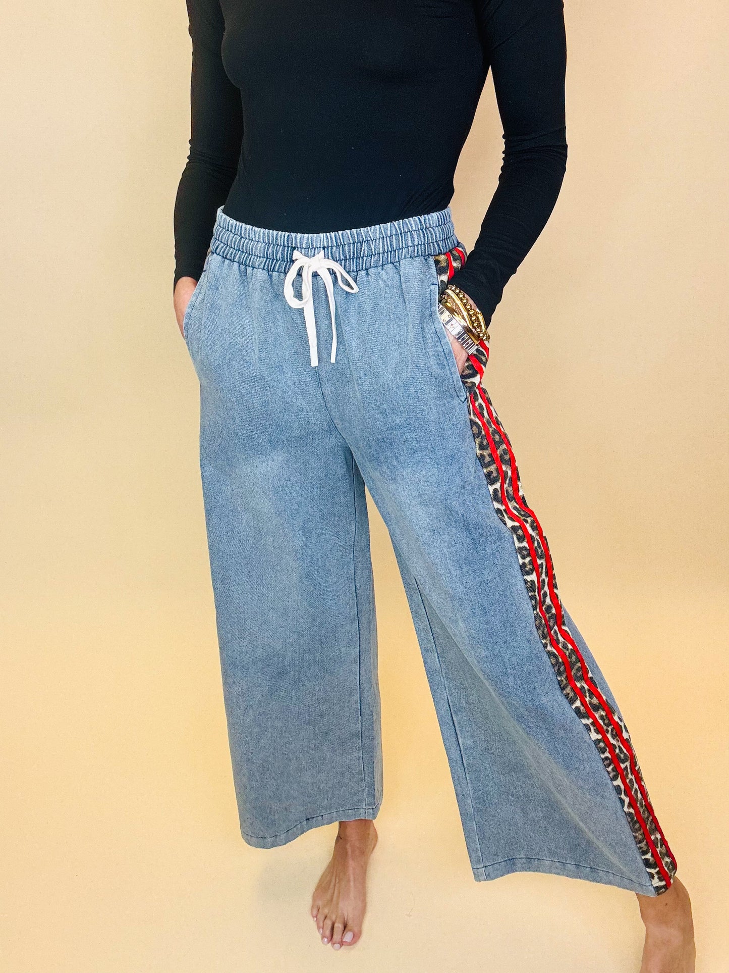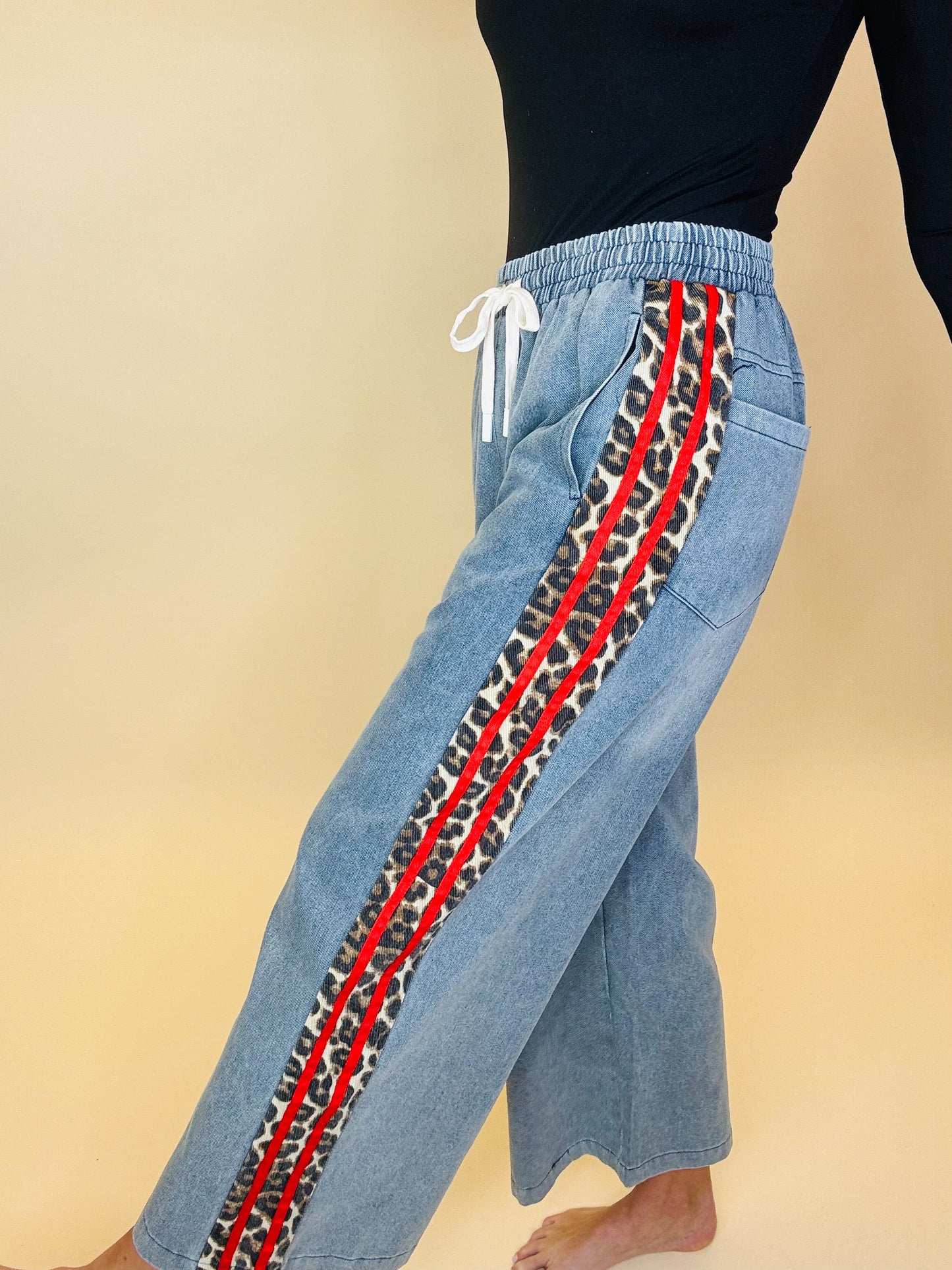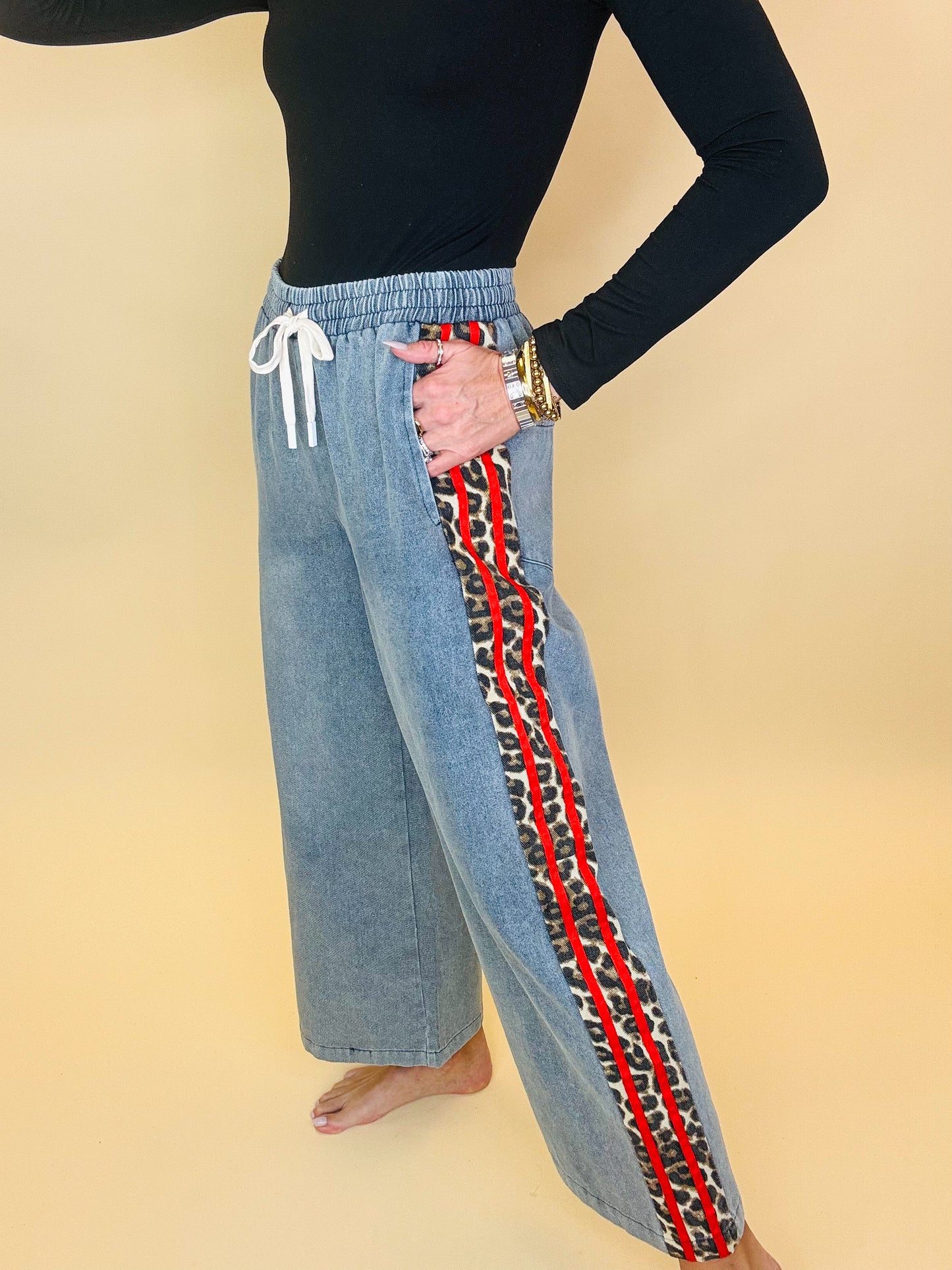 Sporty meets sassy in the Wild Stripe Denim Pants. These soft, lightweight denim pants feature a comfy elastic waistband with a drawstring tie and a relaxed, wide-leg silhouette for an easy, all-day fit. The standout detail? Bold side stripes mixing leopard print with vibrant red accents — giving you that perfect blend of casual comfort and fierce personality. Pair them with a basic tee, a cozy pullover, or your favorite sneakers for a fun, elevated everyday look.